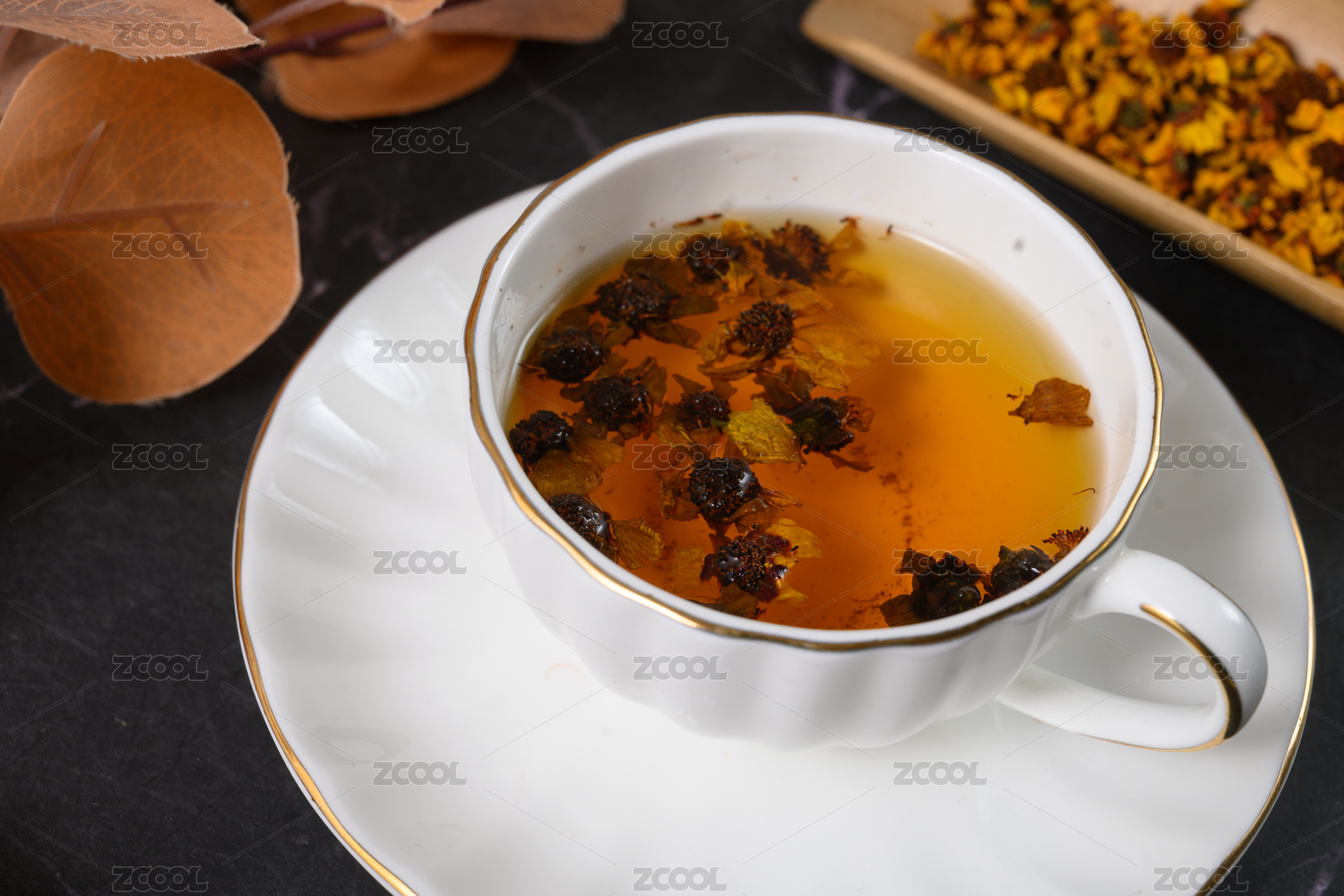 桌面上的杯子里的清香四溢的金莲花茶