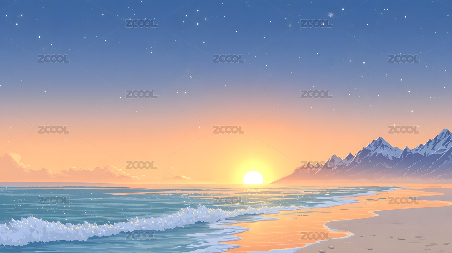 海边日落时分的梦幻星空与海浪