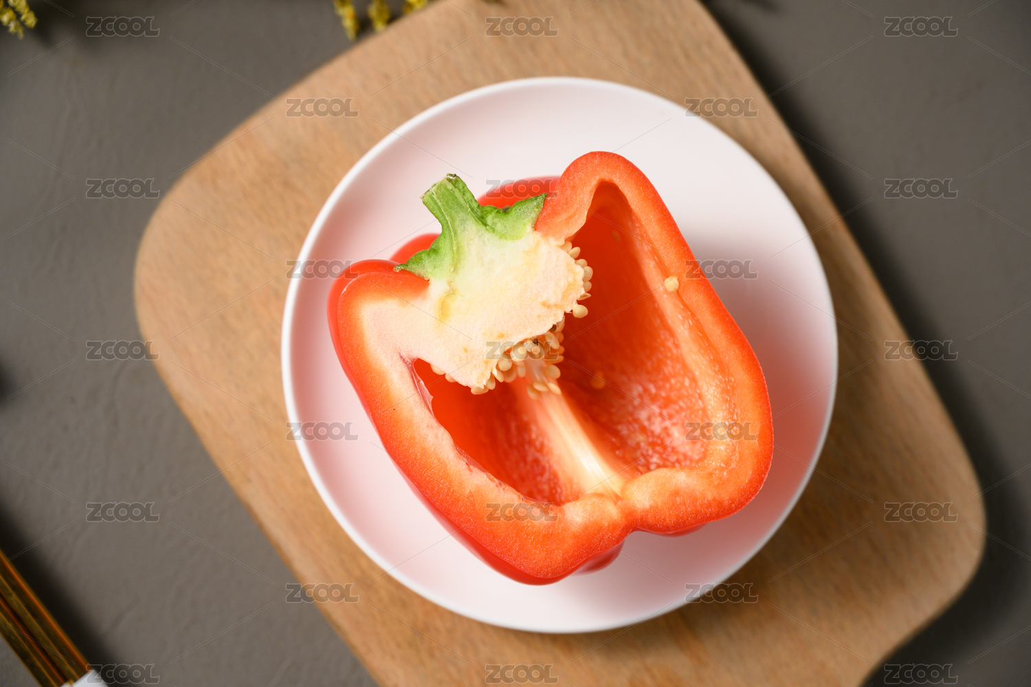 桌面上的盘子里的切开的红辣椒