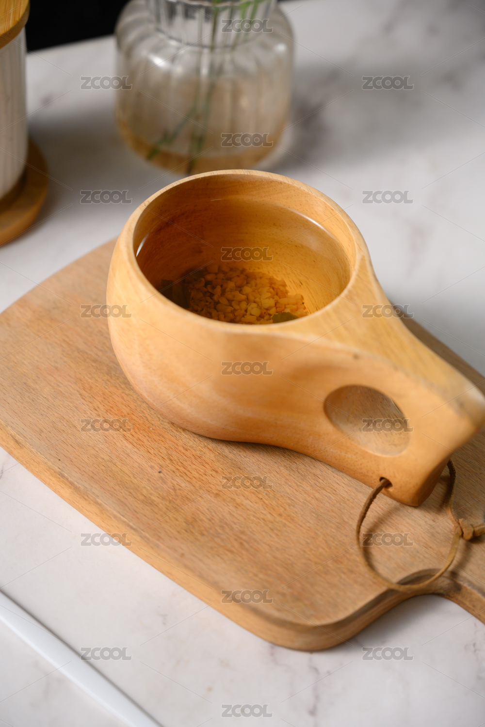 桌面上的杯子里的甘甜可口的辣木籽茶