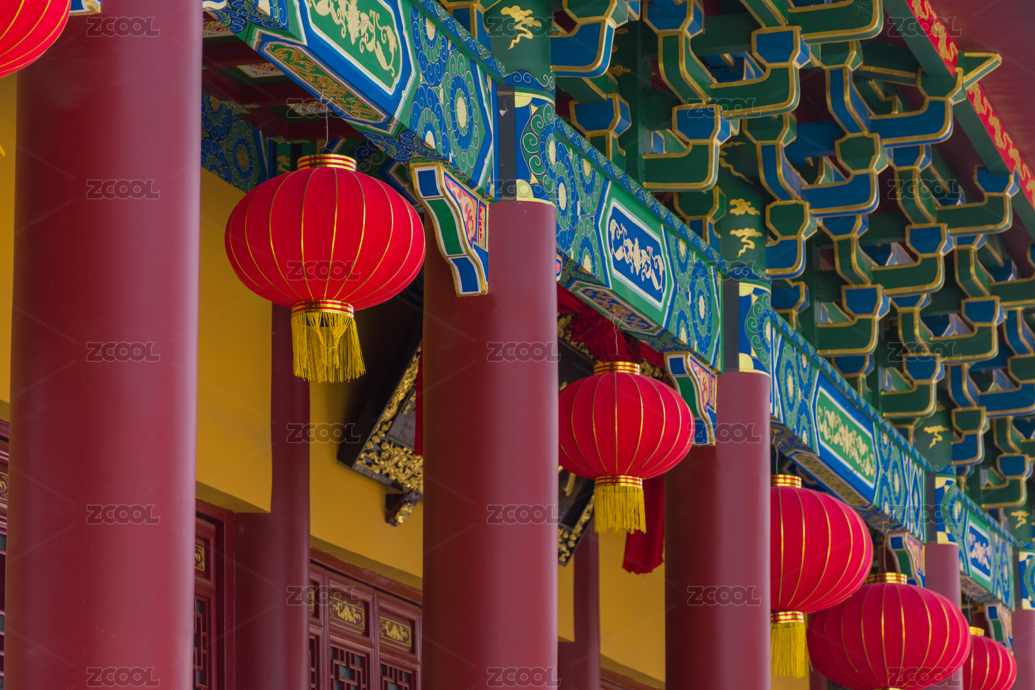 中式斗拱木结构建筑下挂着的一排红灯笼