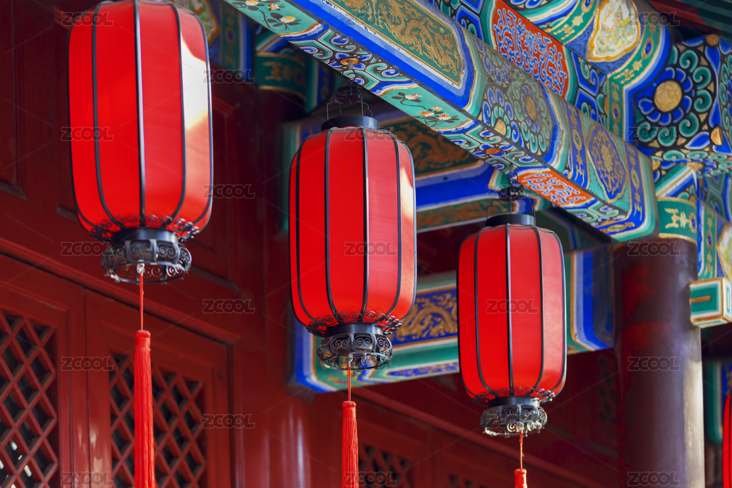 古建筑屋檐下悬挂的中国传统红灯笼