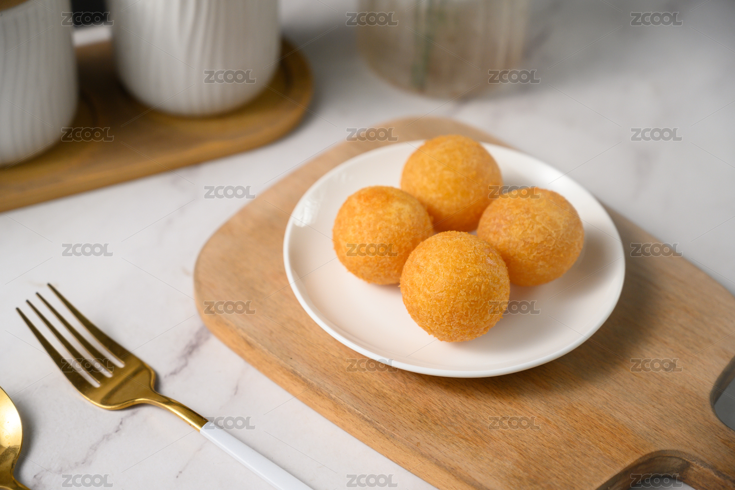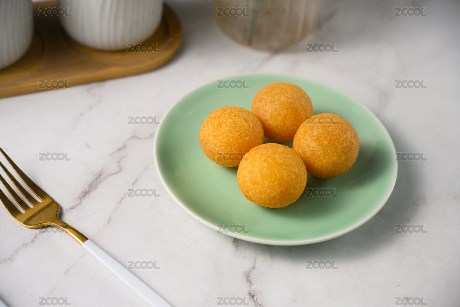 桌面上的盘子里的美味可口的地瓜芝士丸