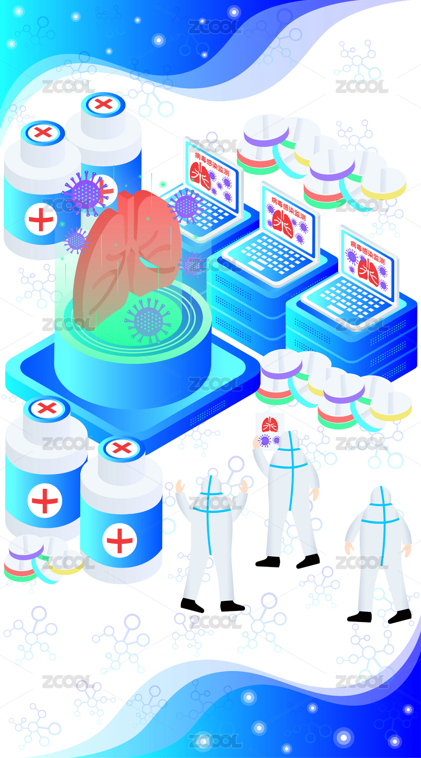 医生分析肺炎CT检查报告炫彩科技风插画