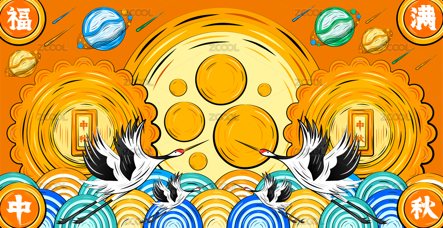 仙鹤狂欢庆祝贺中秋国潮月饼送福矢量插画