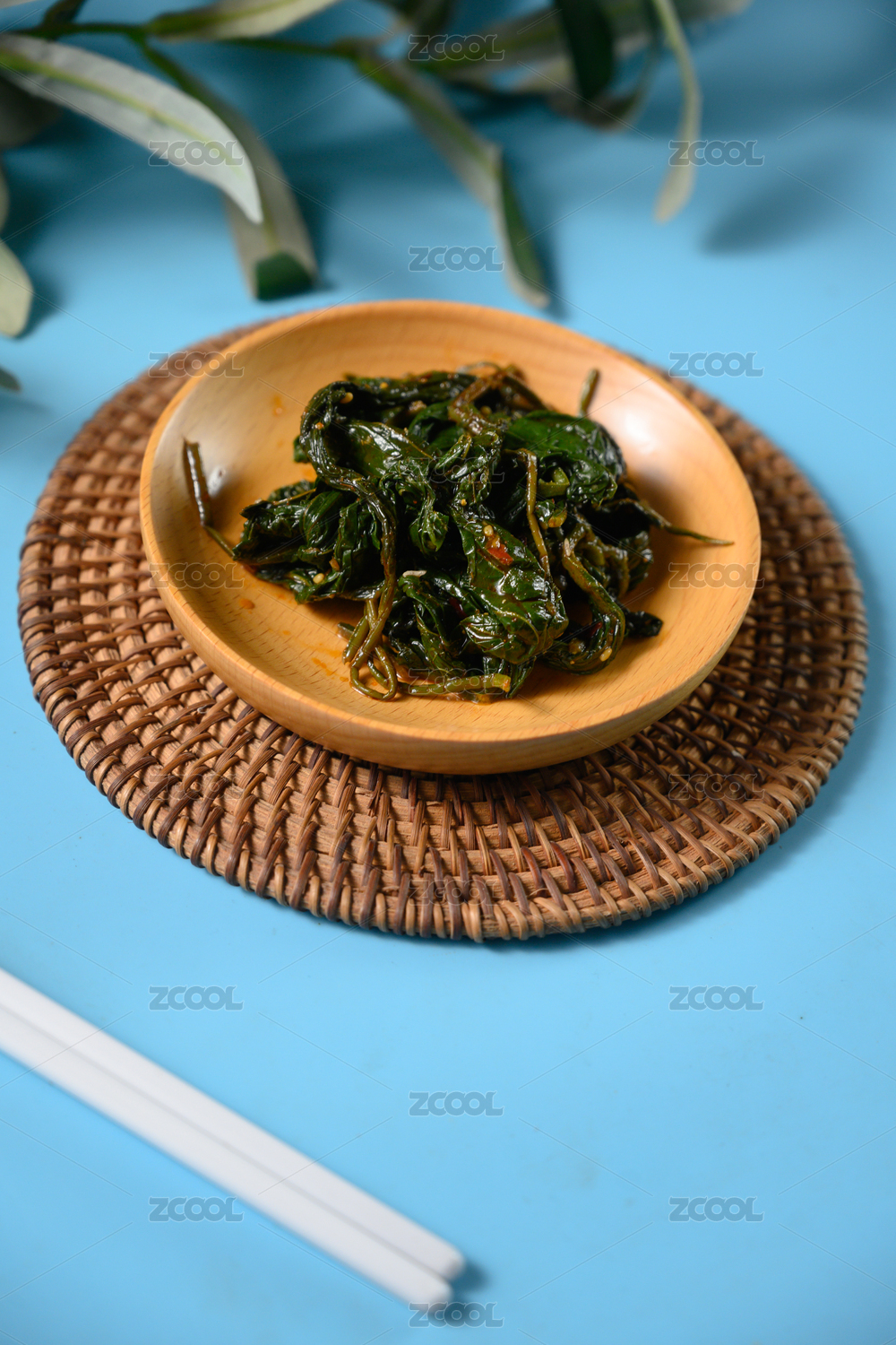 桌面上的盘子里的美味可口的凉拌苏子叶