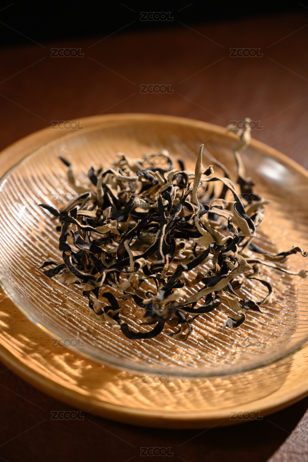 桌面上的盘子粒的干爽的干木耳丝
