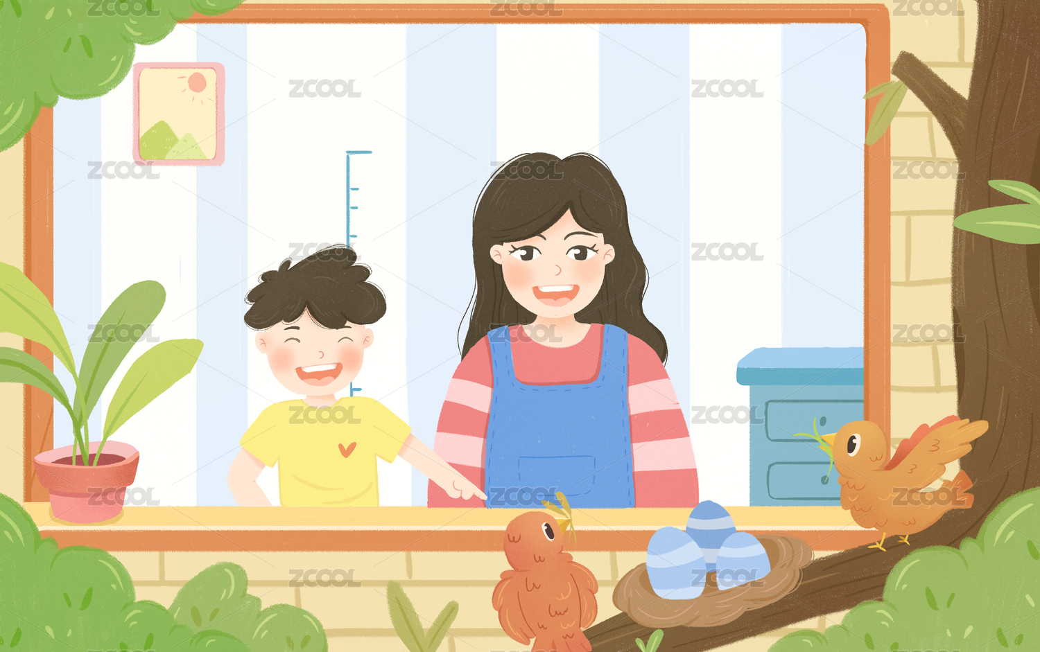 妈妈孩子窗外看小鸟