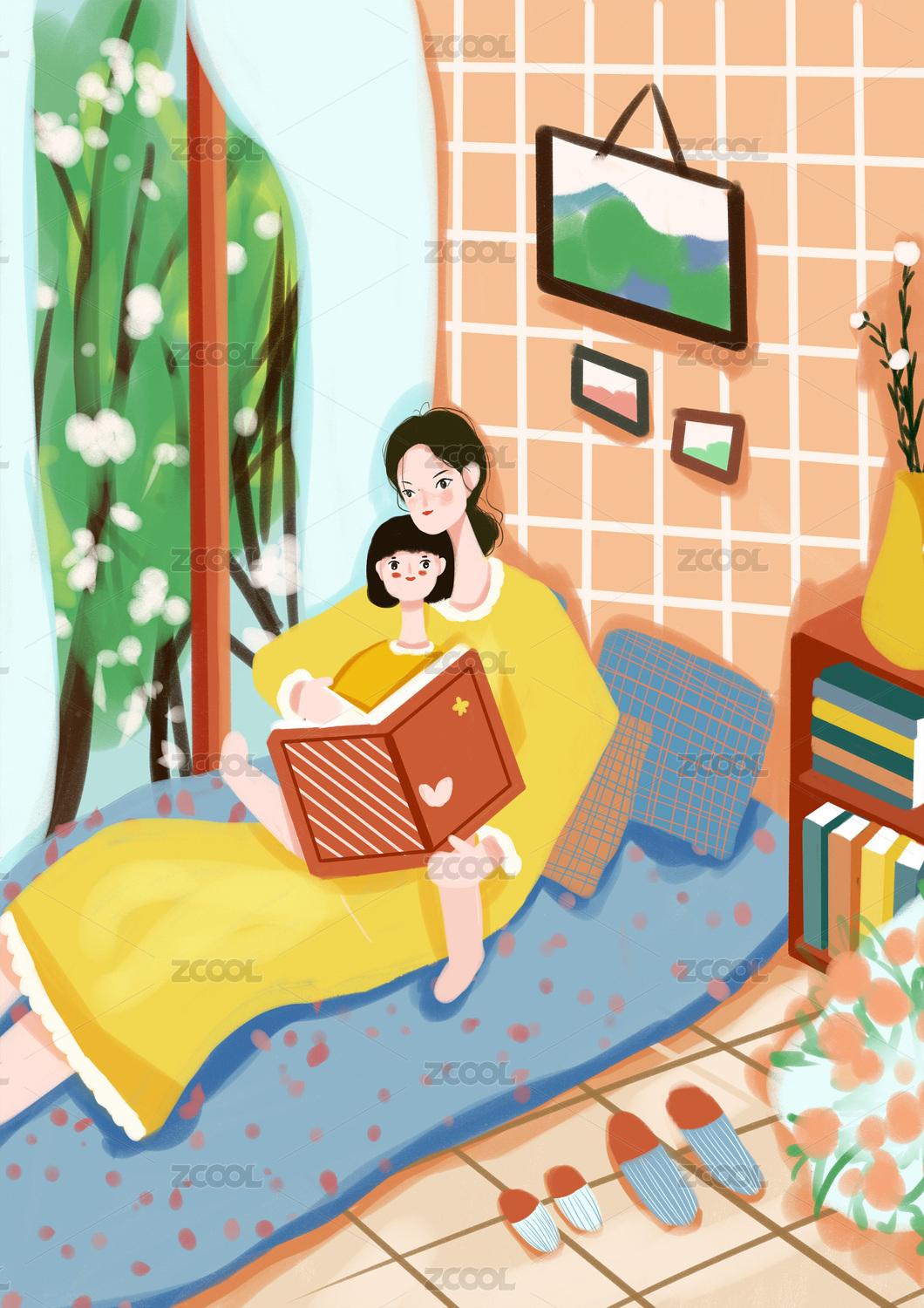坐窗台一起读书的母女