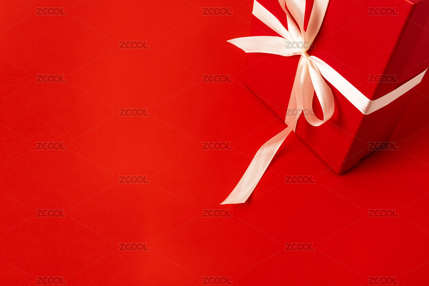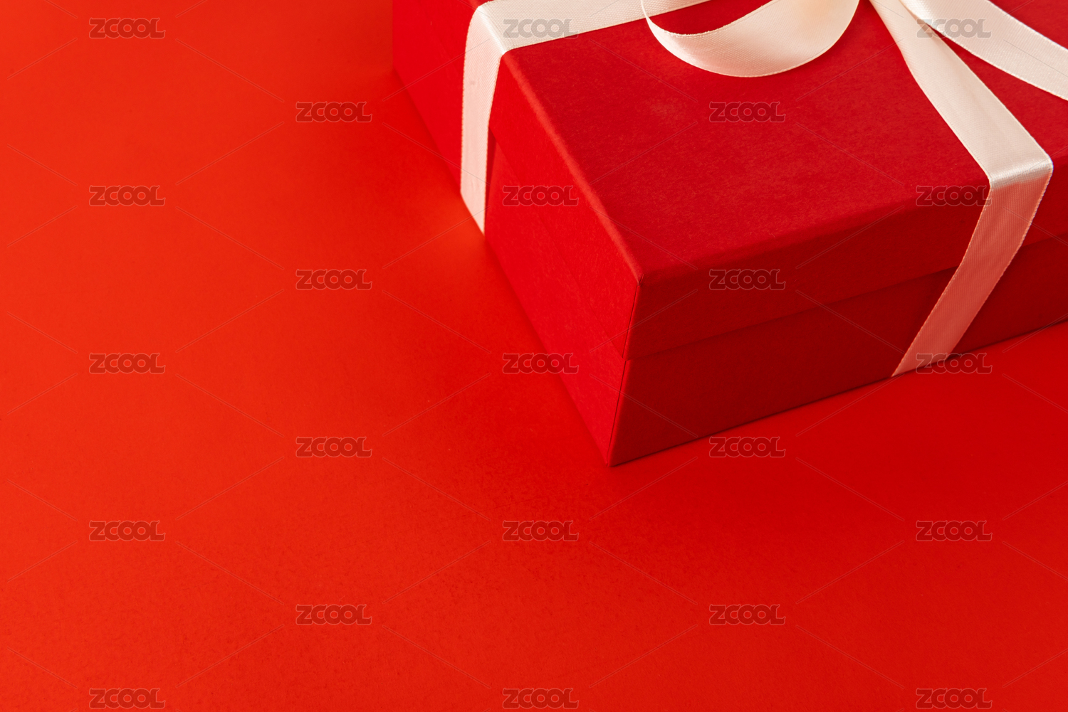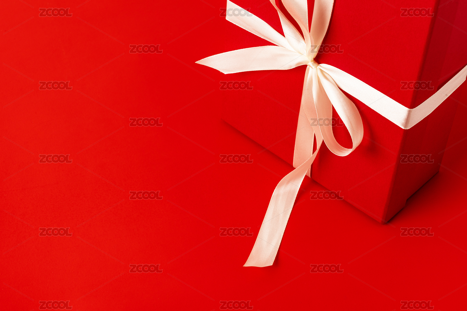 放在红色背景的绑着香槟色带子的红色礼物盒局部