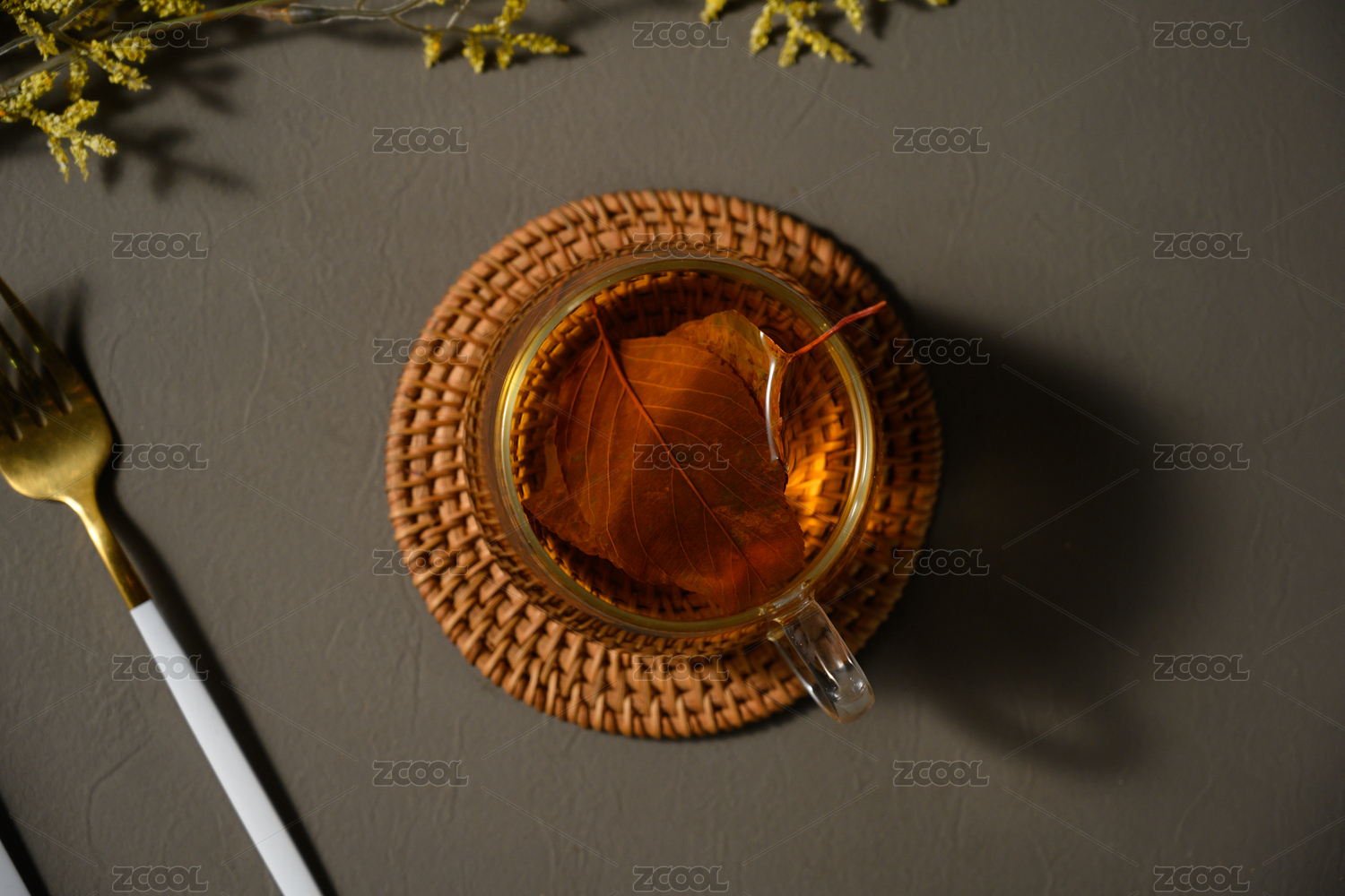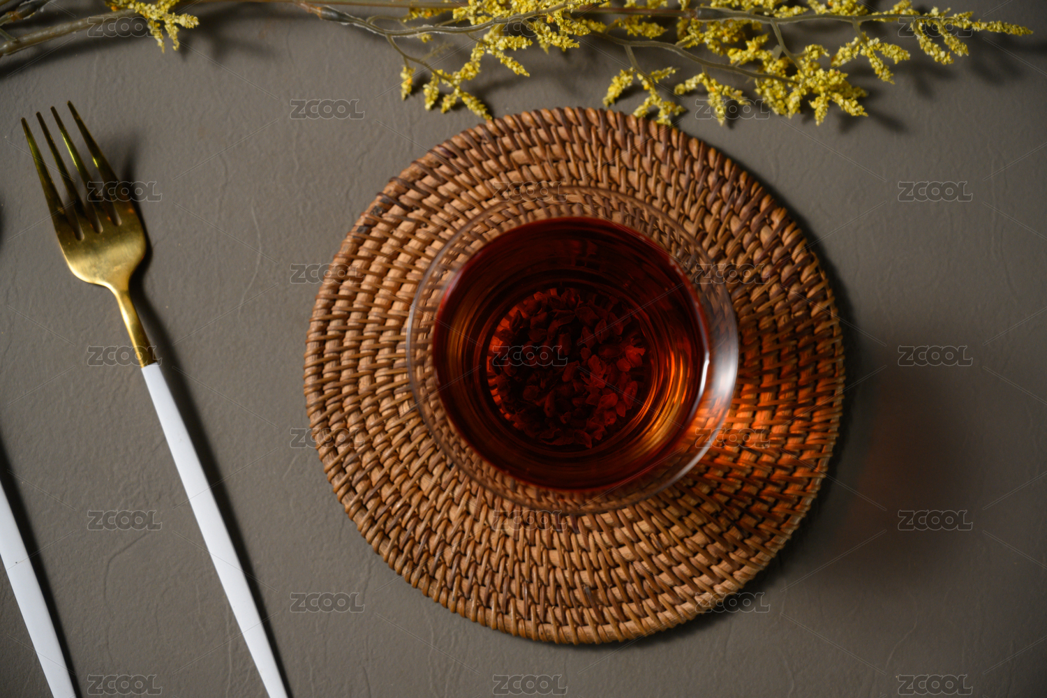 桌面上的杯子里的甘甜可口的茶花花茶