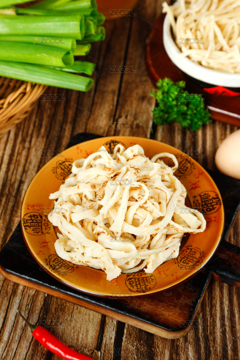 木底上放着一盘切条的煎饼和筷子夹着饼