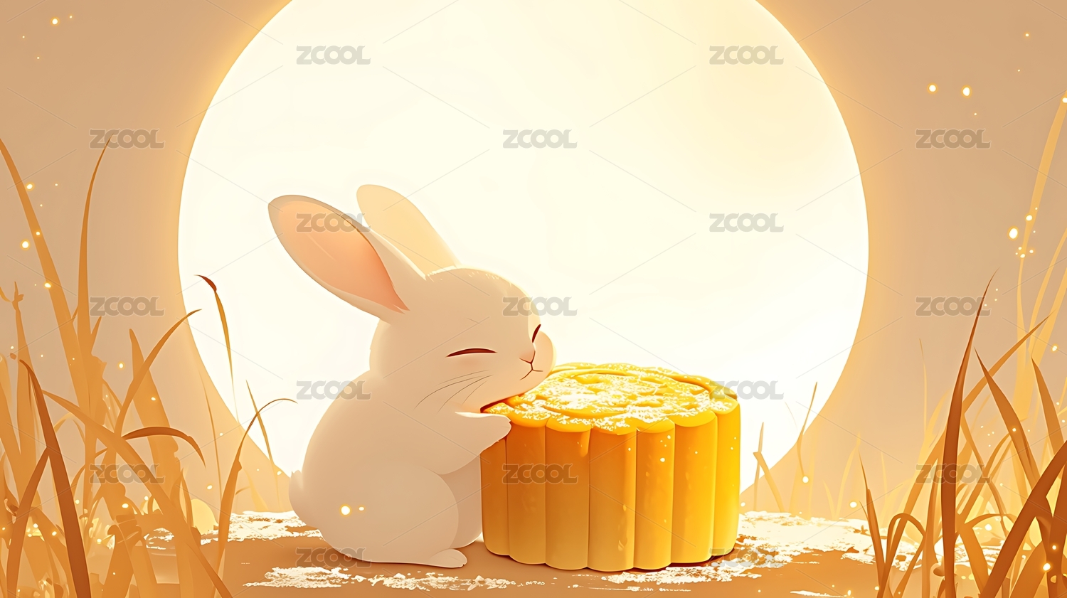 中秋节满月背景下正在吃月饼的可爱玉兔