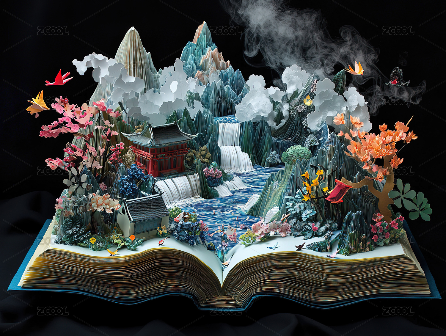 立体书,纸艺,山脉,森林,树木,河流,云雾,山景,自然,景观