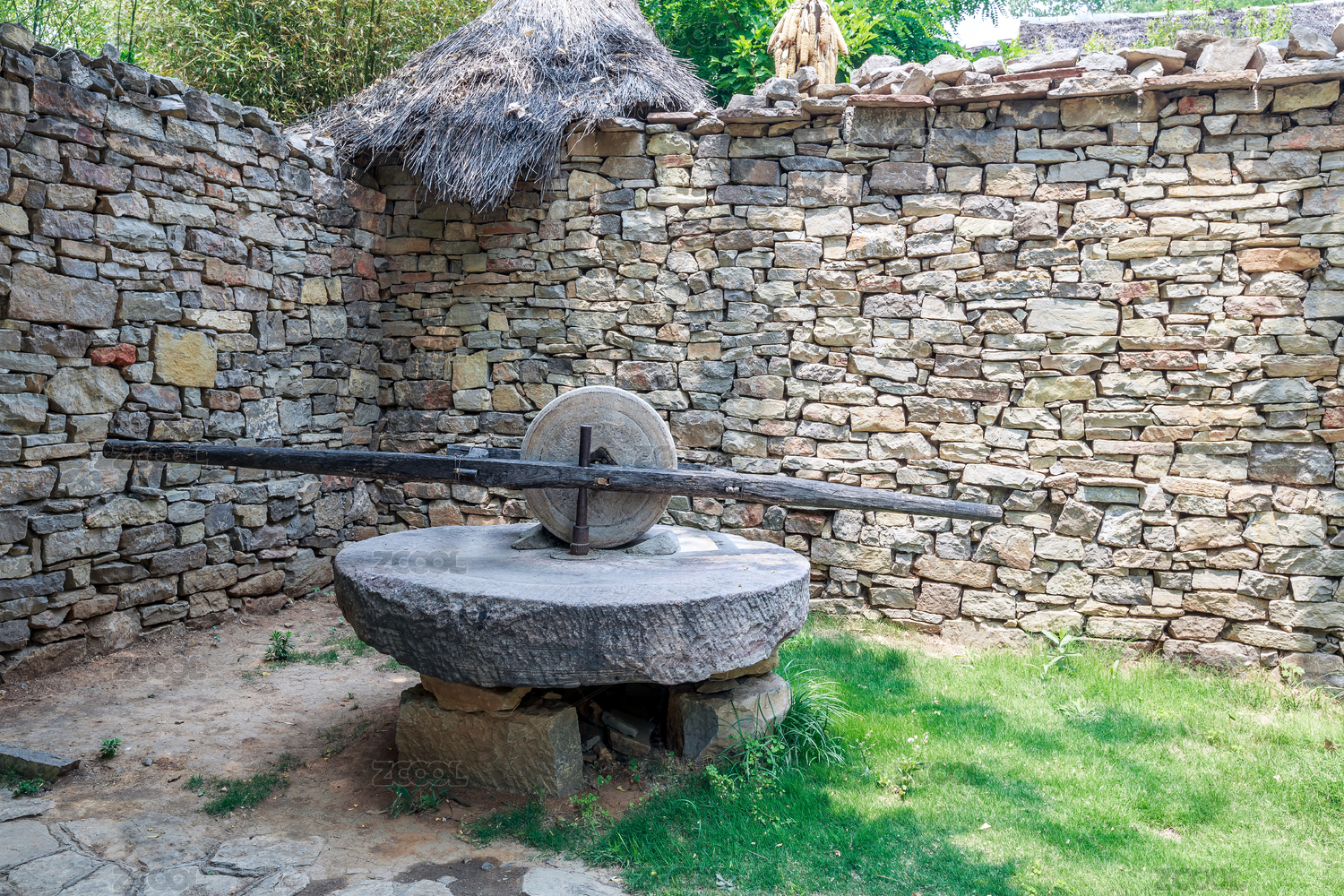 中国山东省临沂市沂蒙红色影视基地内沂蒙山村的石碾子