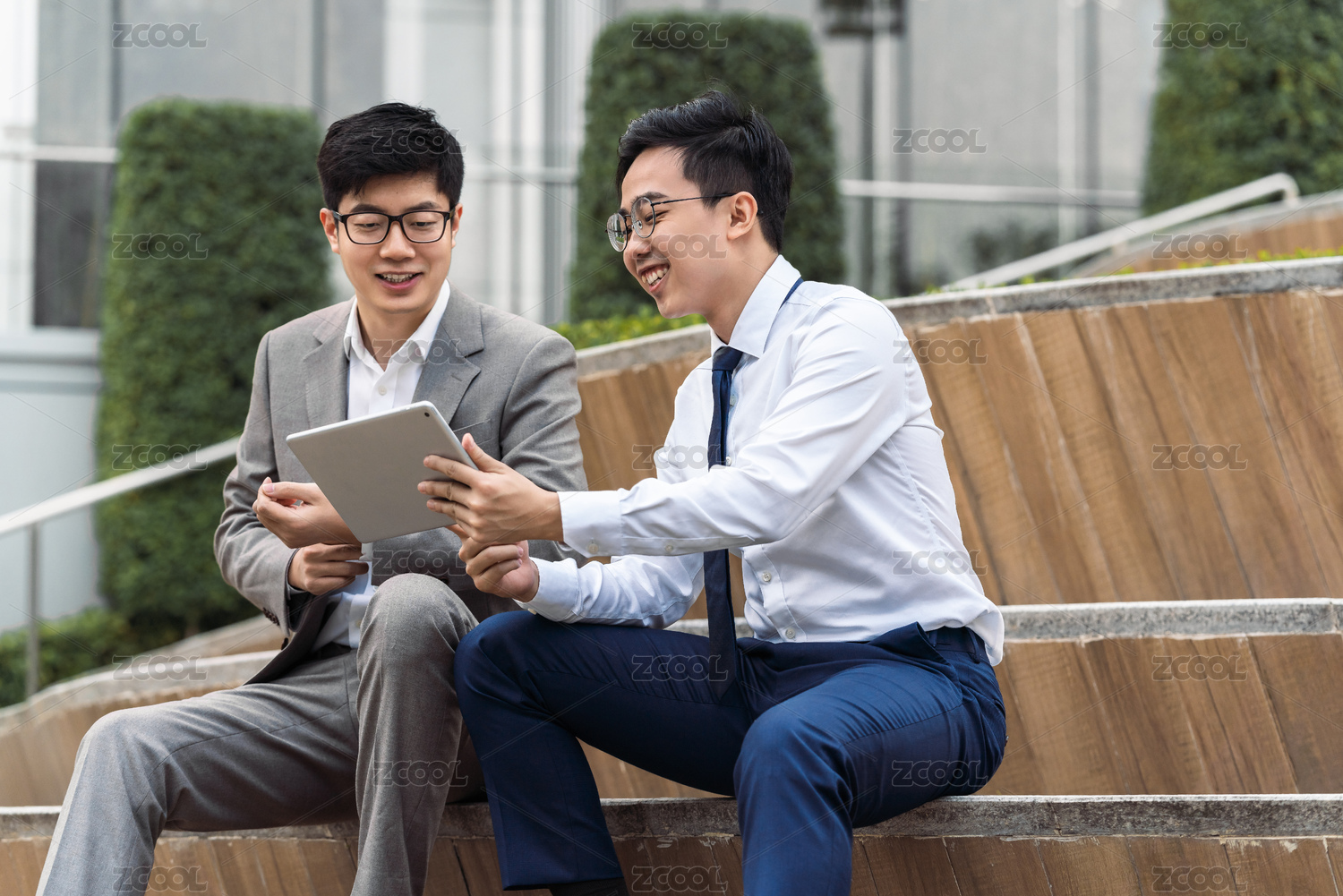 亚洲办公室员工表示平板解释教学项目的主管。在公司的院子里坐在并排。