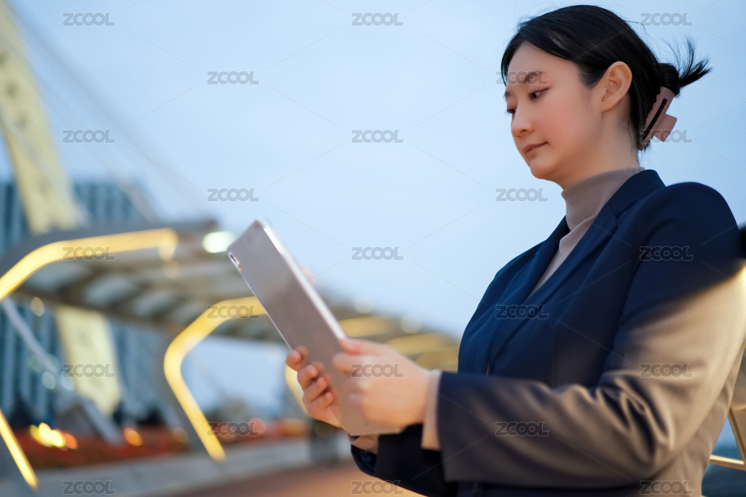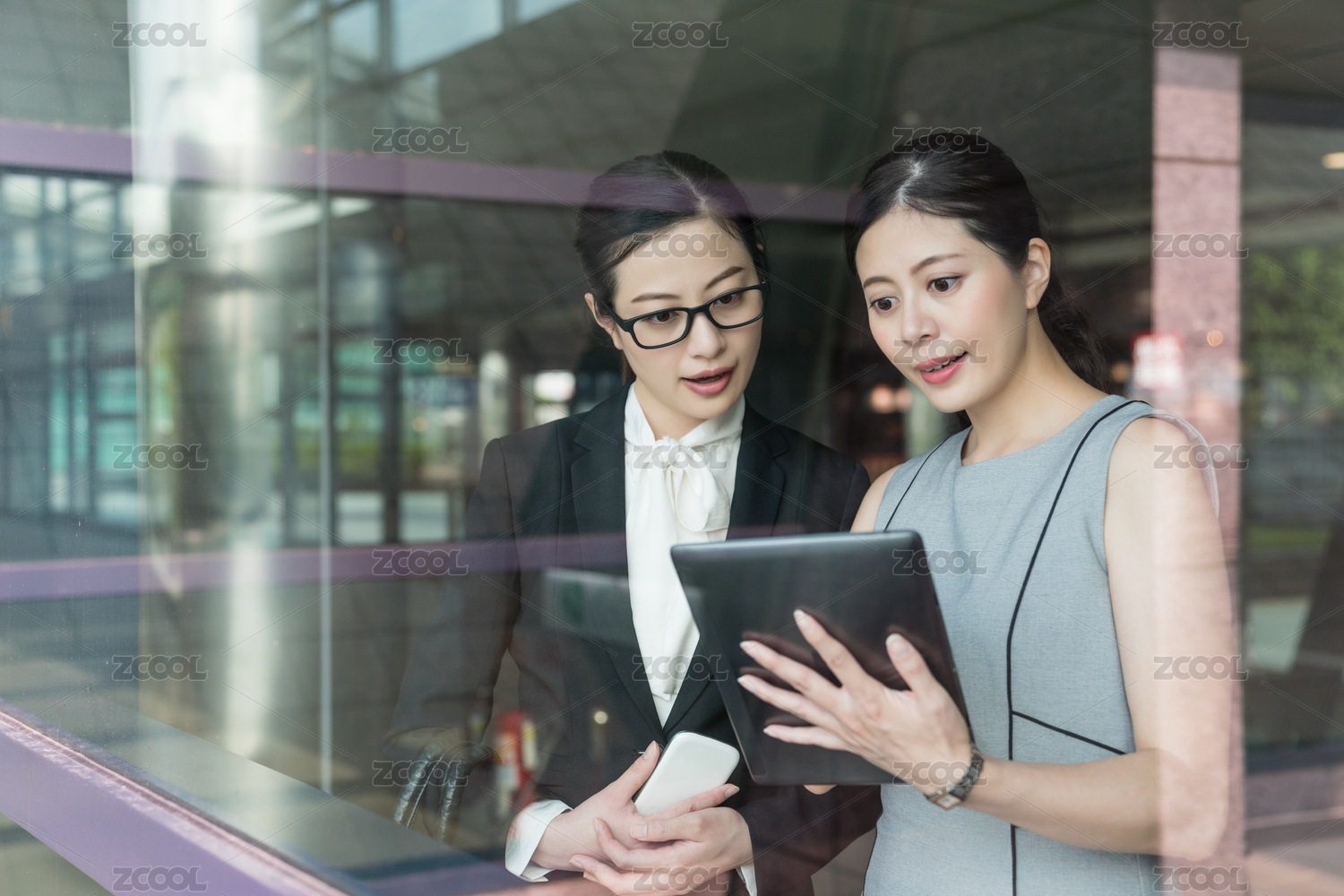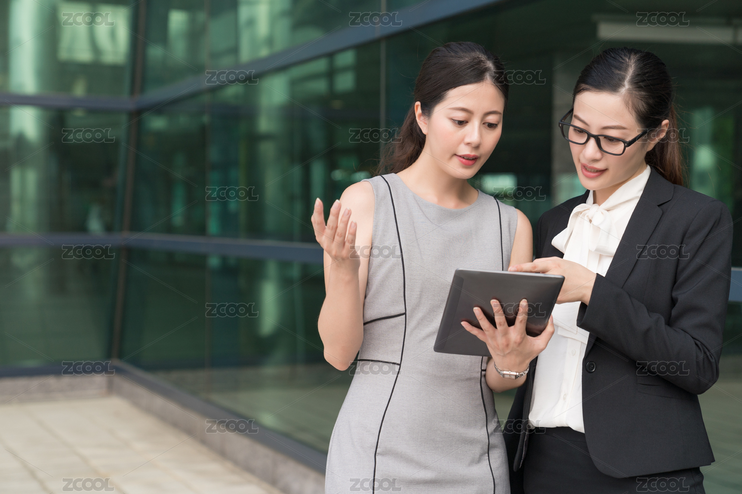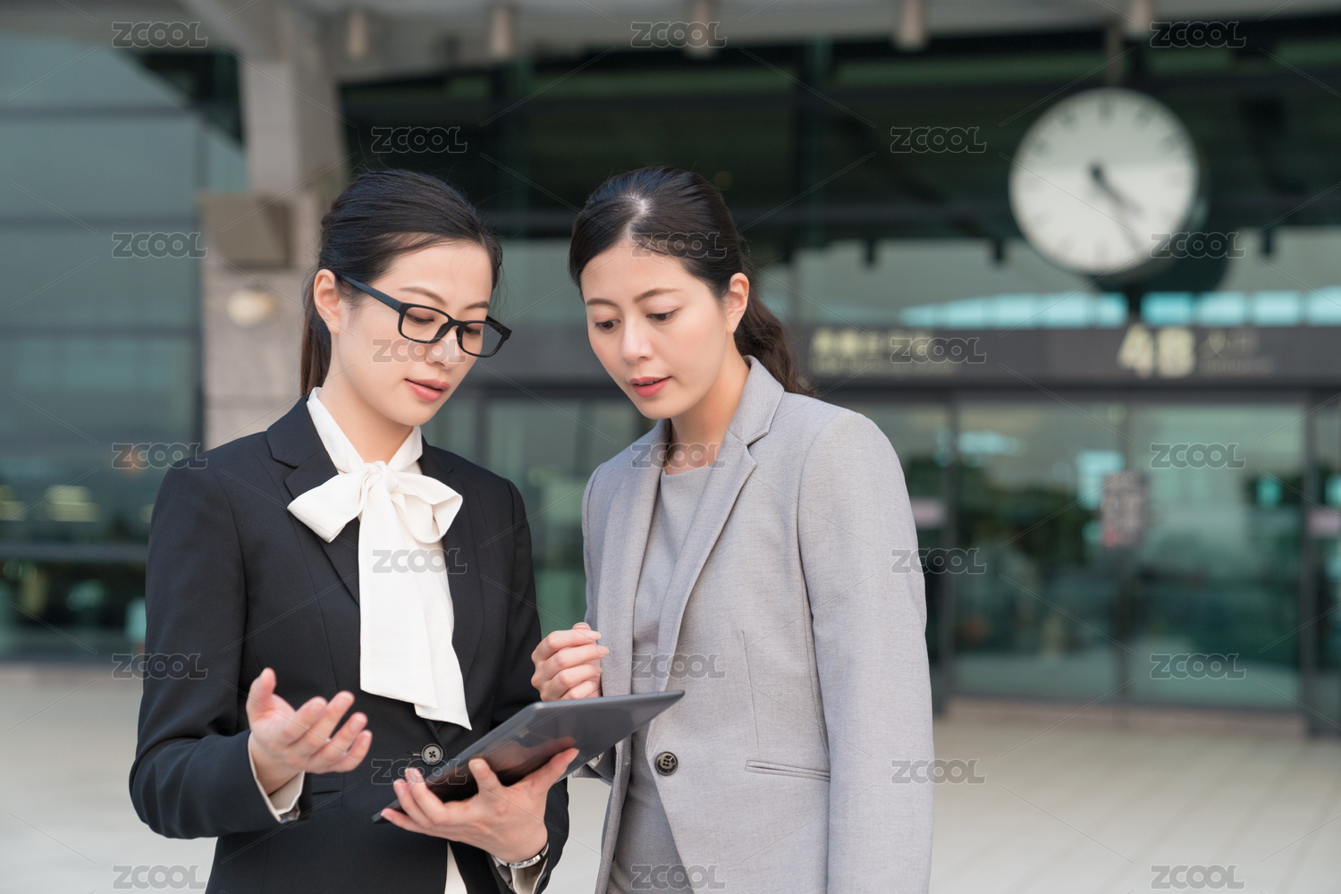 两个亚洲办公室女郎利用高铁站外的平板洽谈业务。
