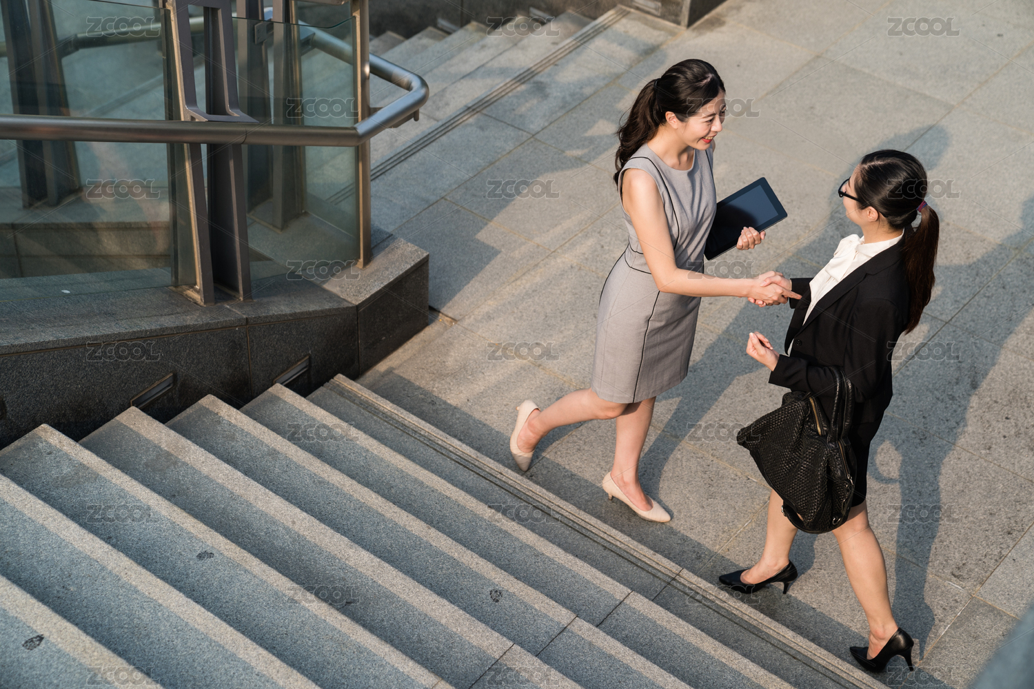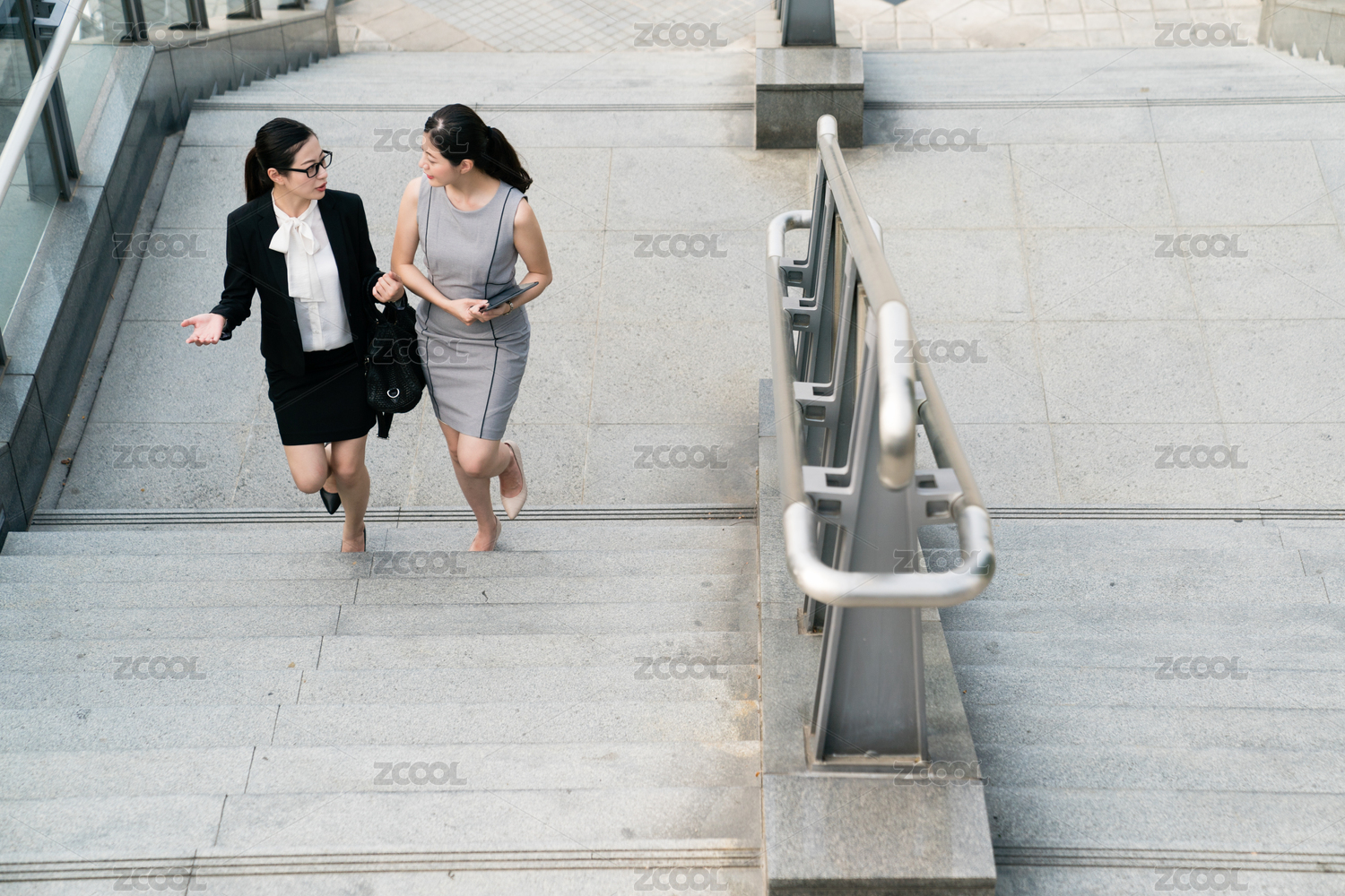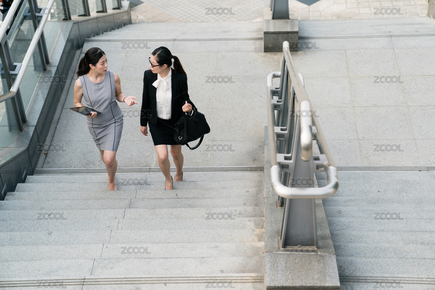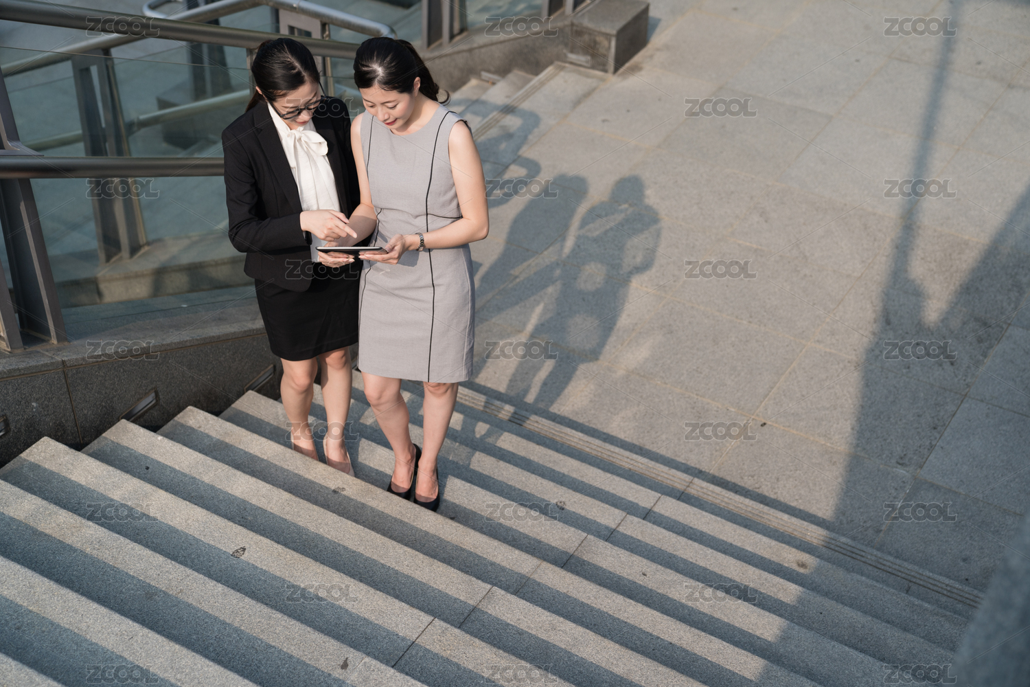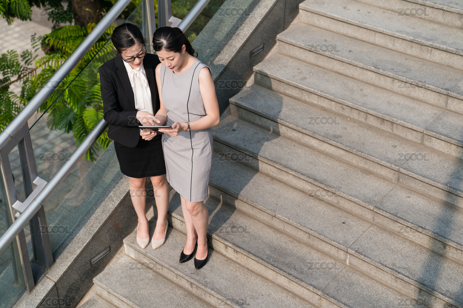 两个亚洲办公室女郎在看着用在楼梯上的平板电脑的正式礼服。上的顶视图。一个是指向表示到另一个。