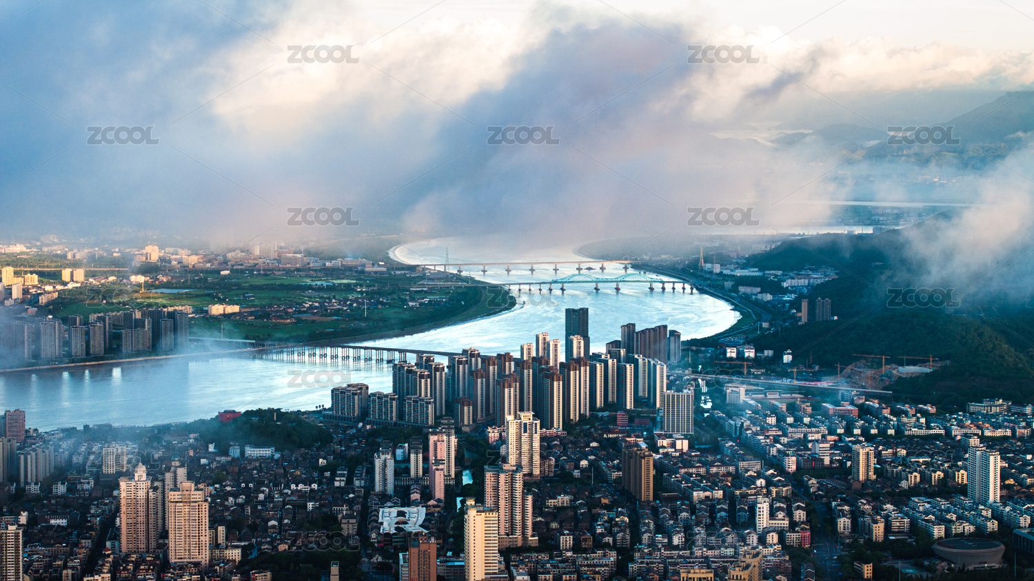 清晨薄雾中的杭州滨江城市建筑风光航拍