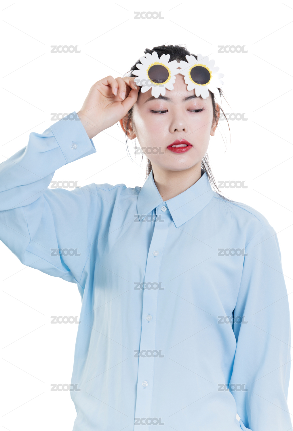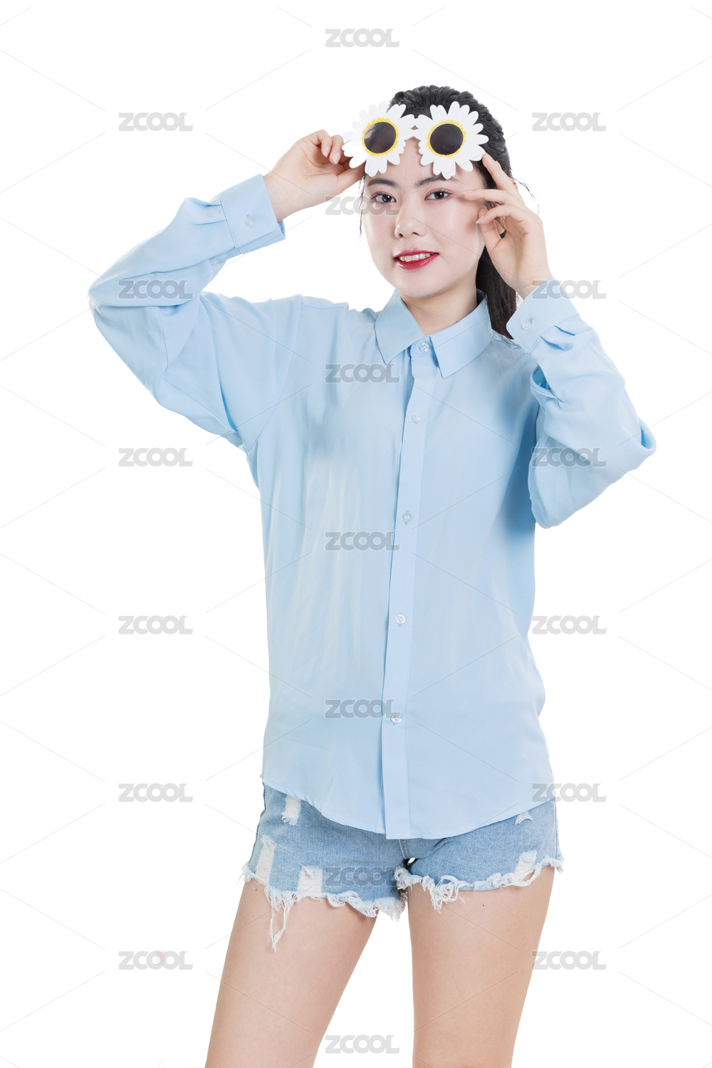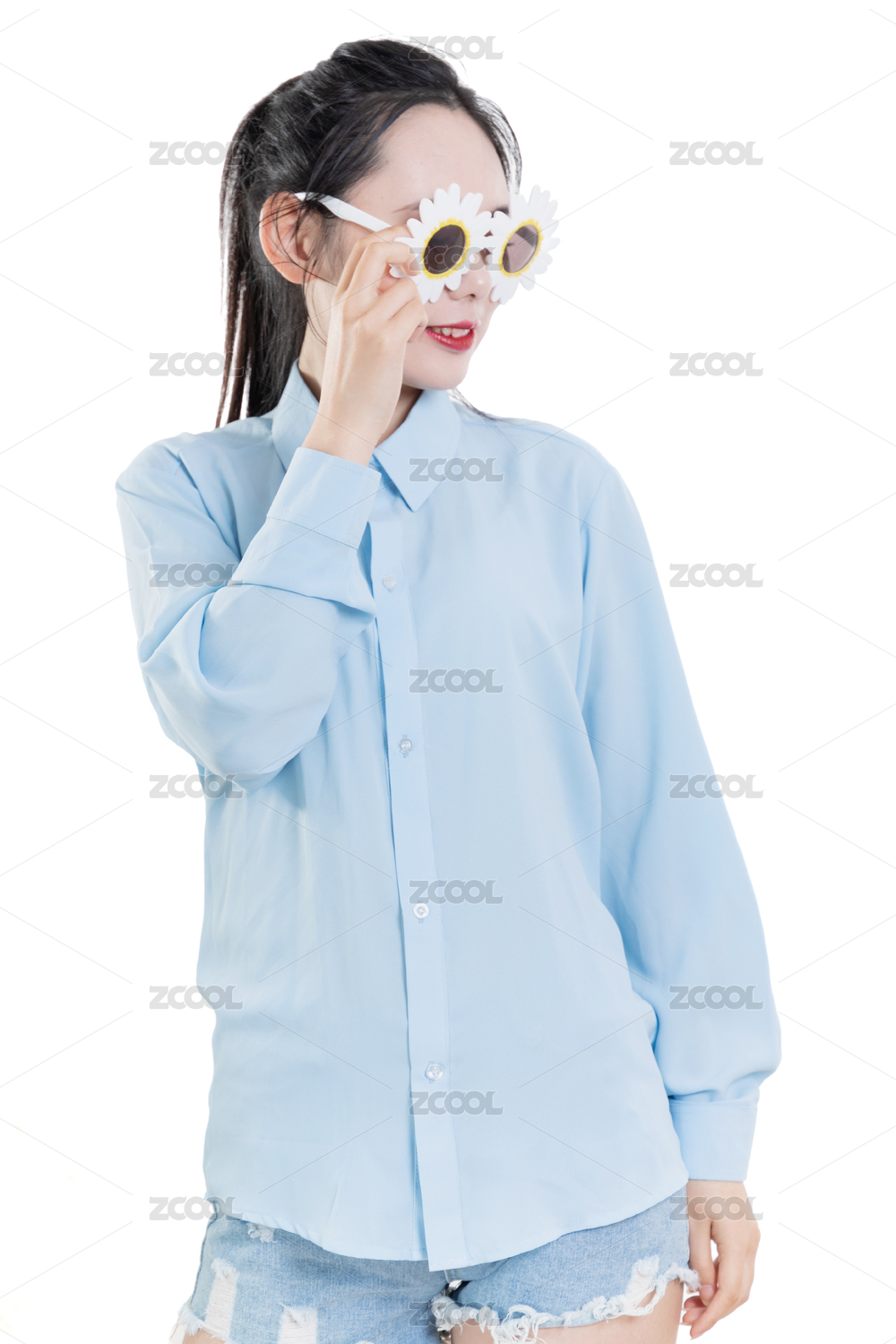 白色背景前穿蓝色衬衣开心大笑的18岁女孩