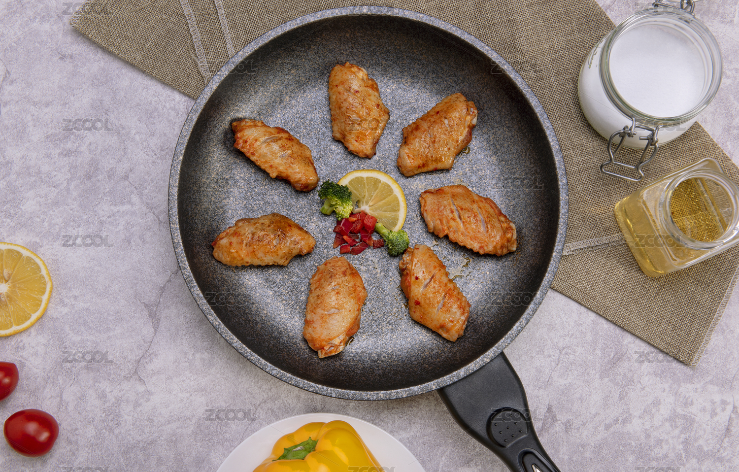 煎锅里放着煎好的鸡翅