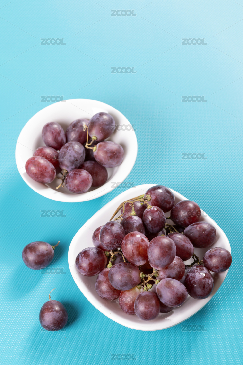白色背景里黑色瓷碗中的葡萄青提