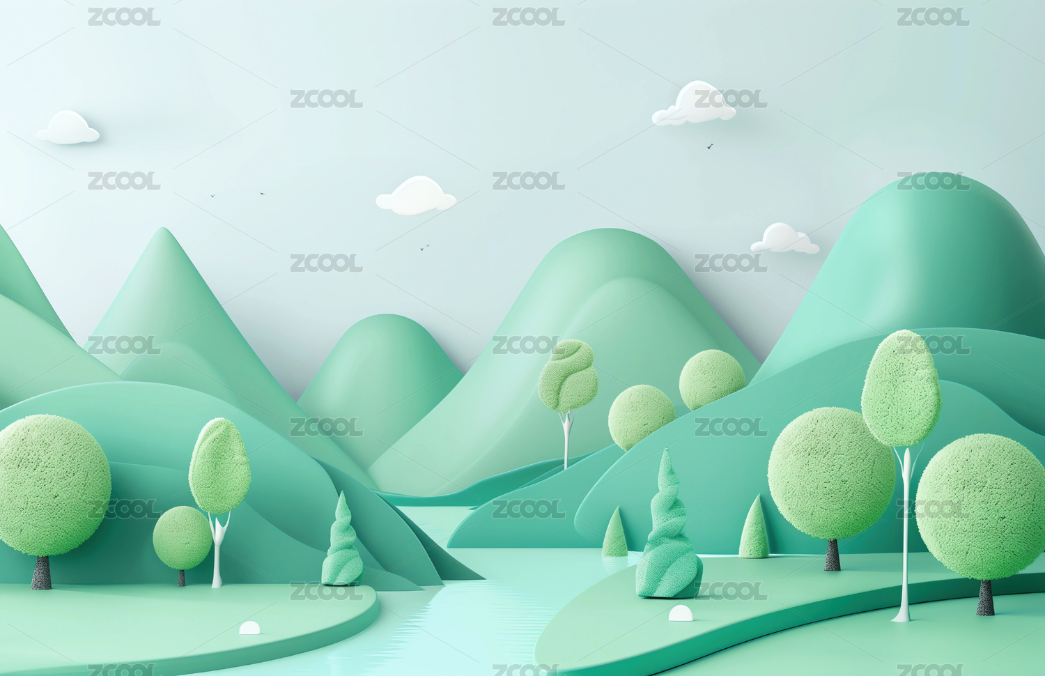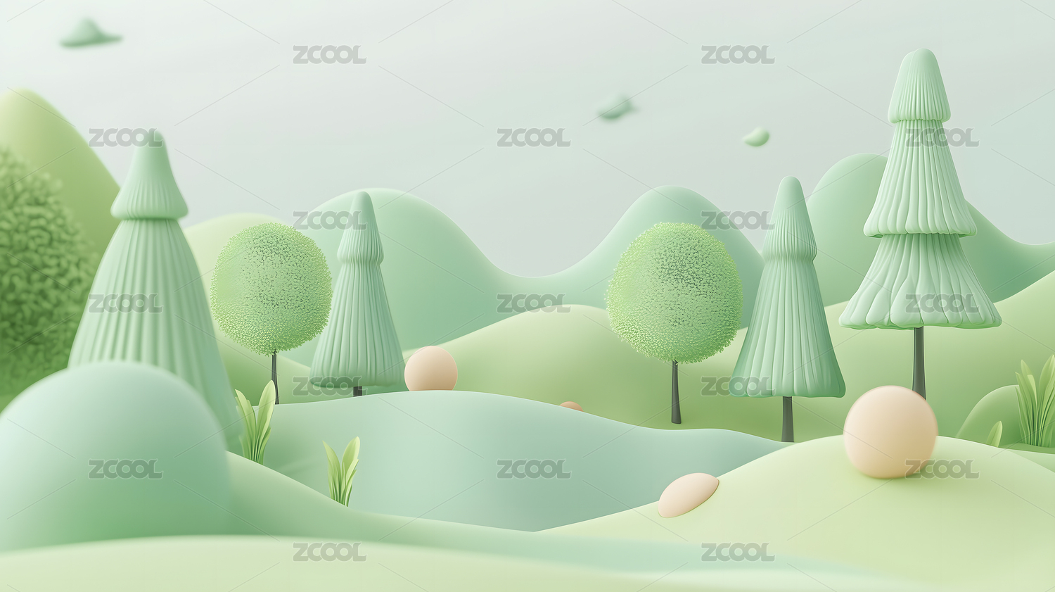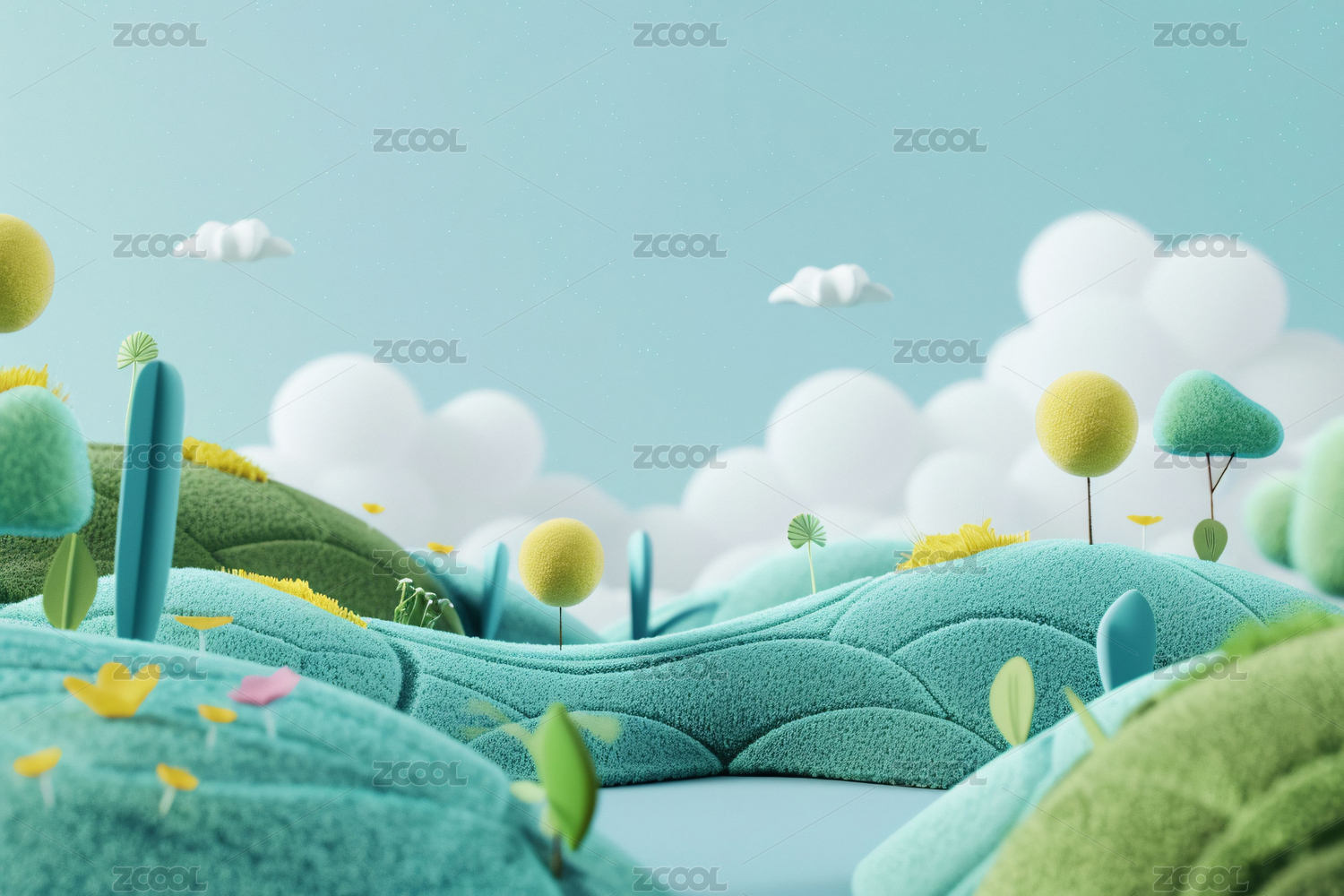 3D毛绒质感的绿色春天开阔场景背景插画