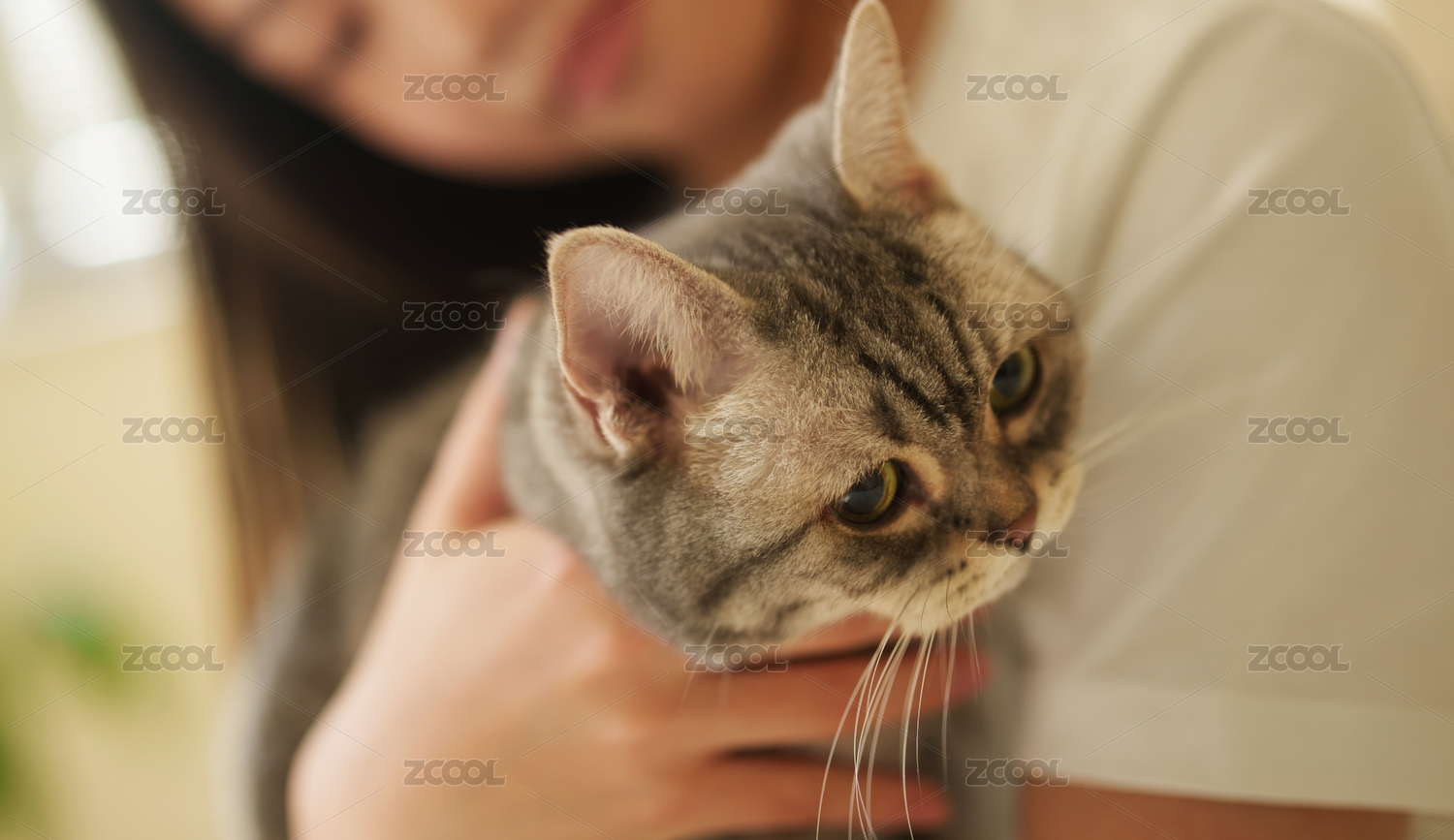 一个亚洲女人抱着一只灰蓝色英国短毛猫