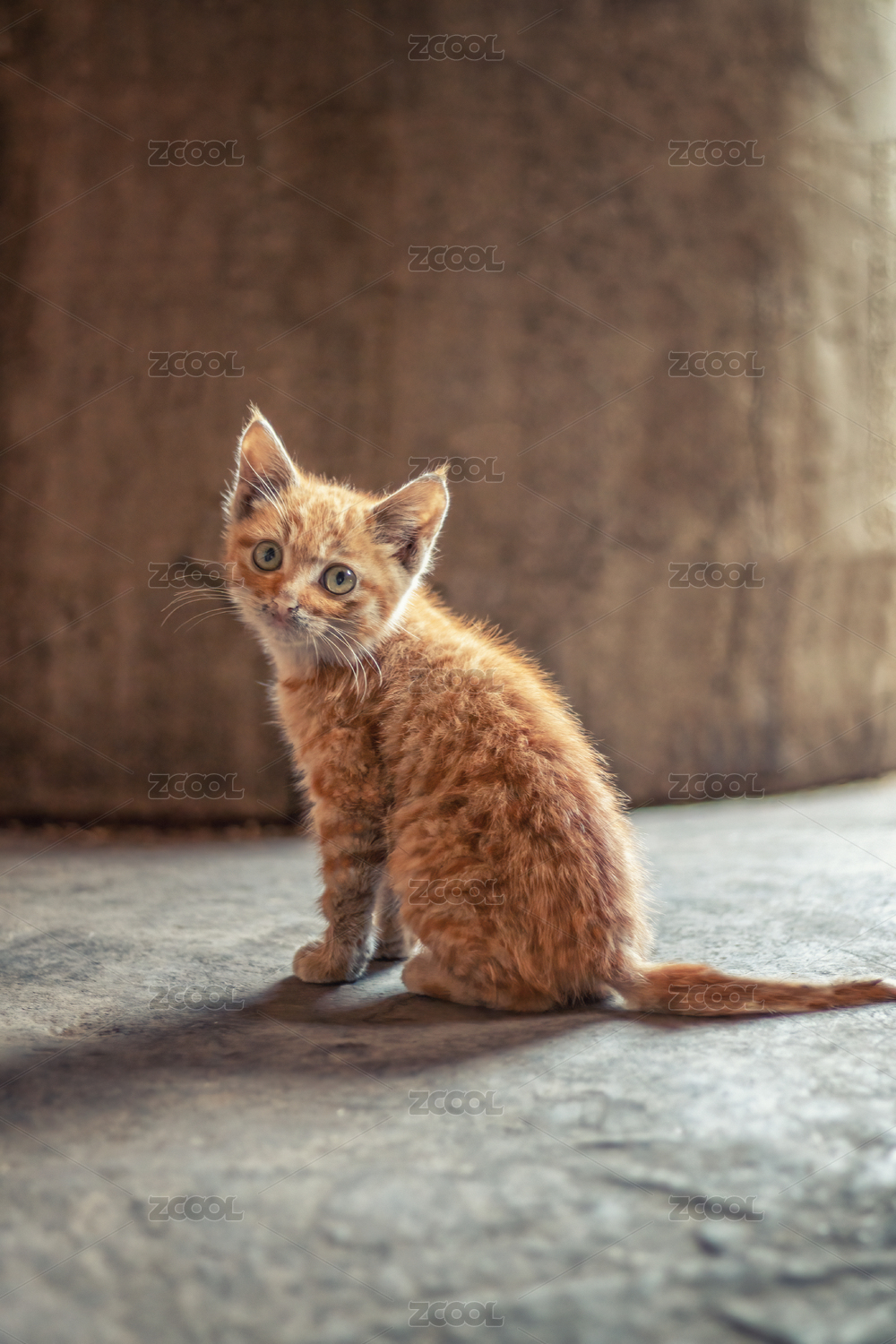 蹲坐在仓库水泥地上看向镜头的小橘猫