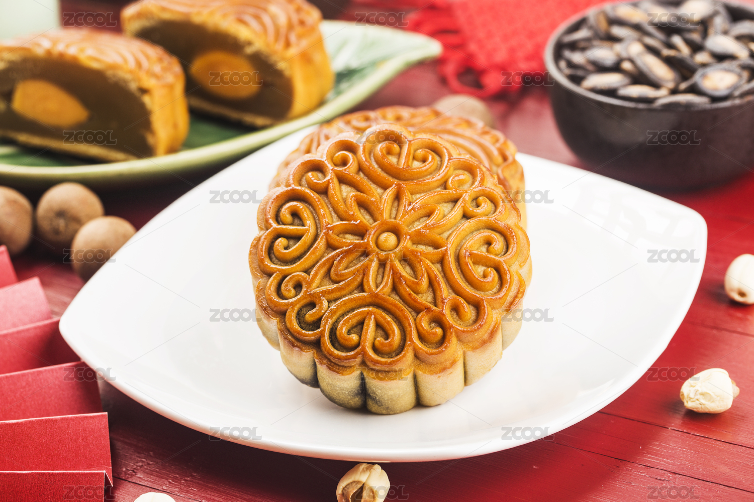 红色背景上的中秋节传统小吃月饼
