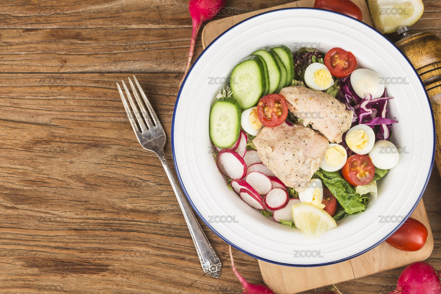 一盘新鲜的鸡胸沙拉放在木桌子上