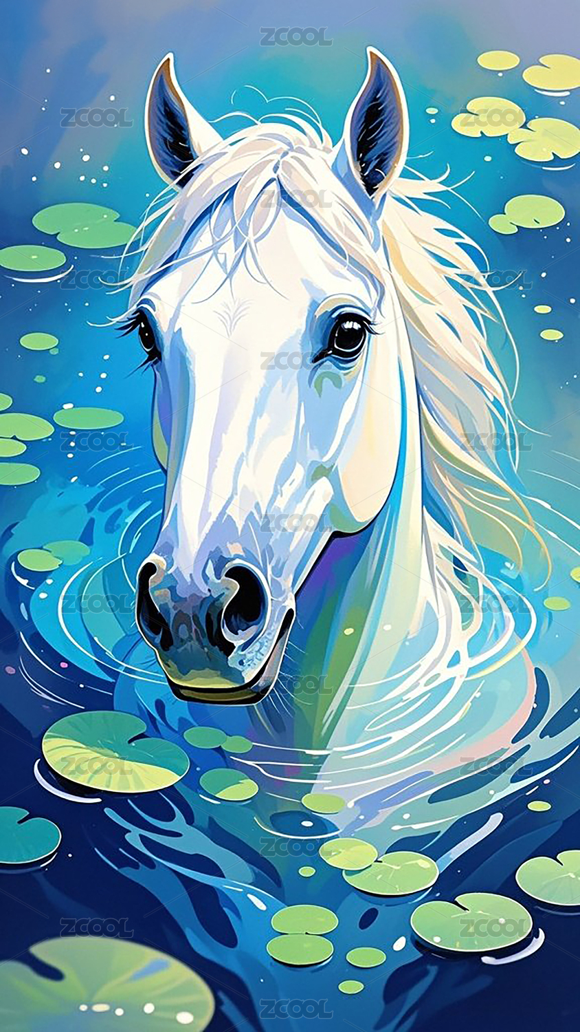 水中伫立白马梦幻光泽插画