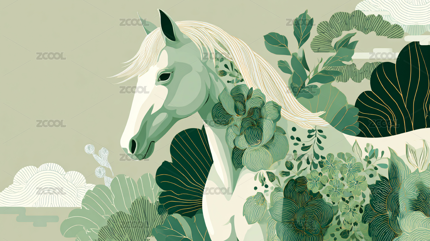 国风花草白马插画