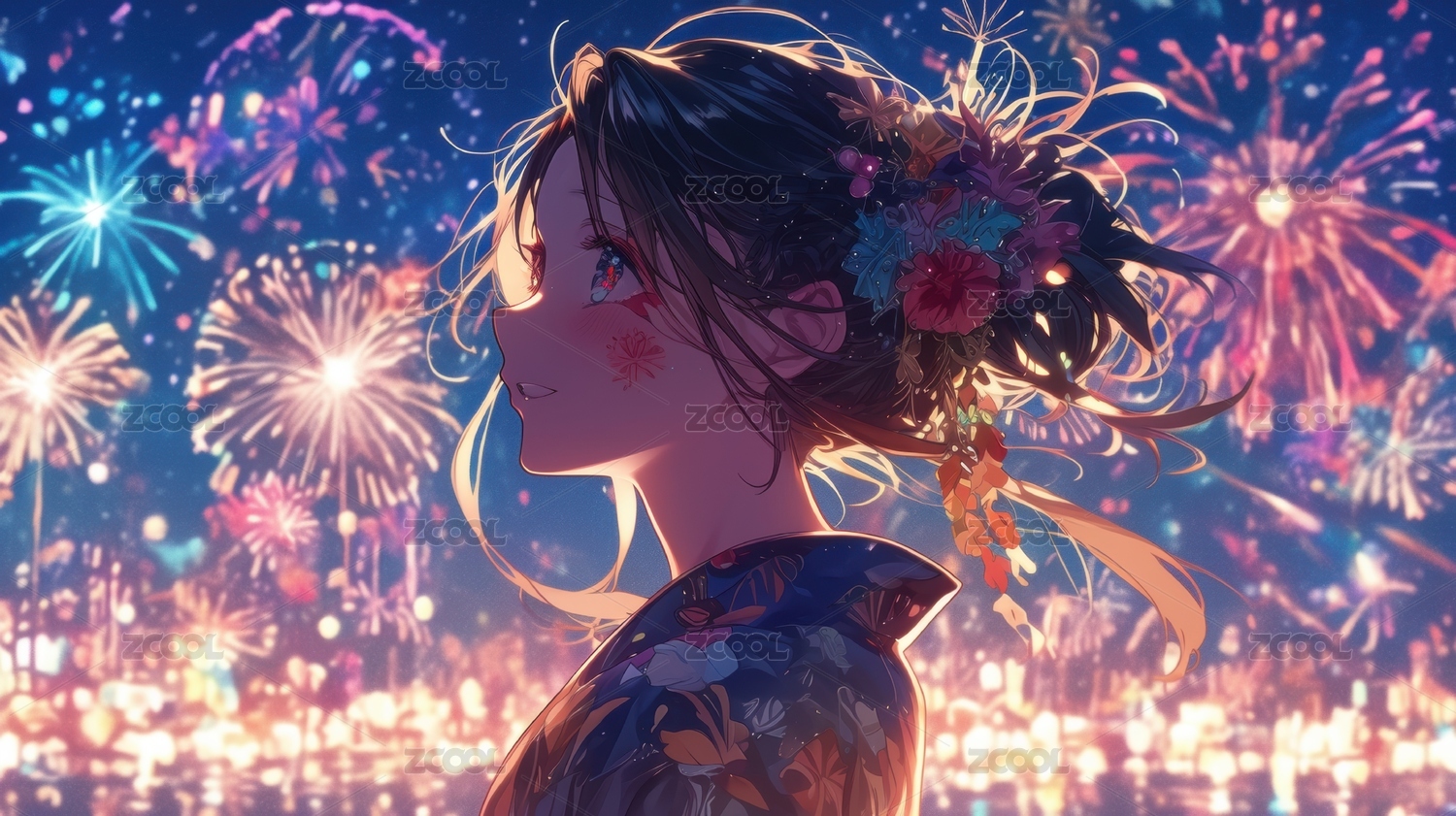 少女,女孩,二次元,漫画,亚洲,日本,可爱,人物,烟花,烟火