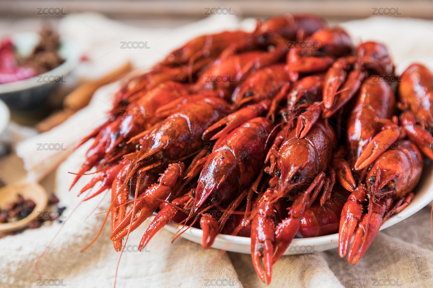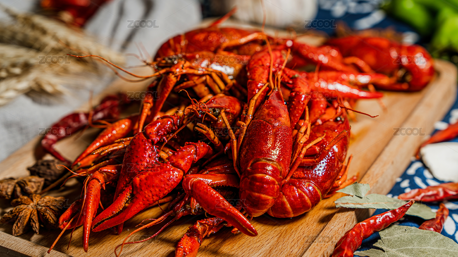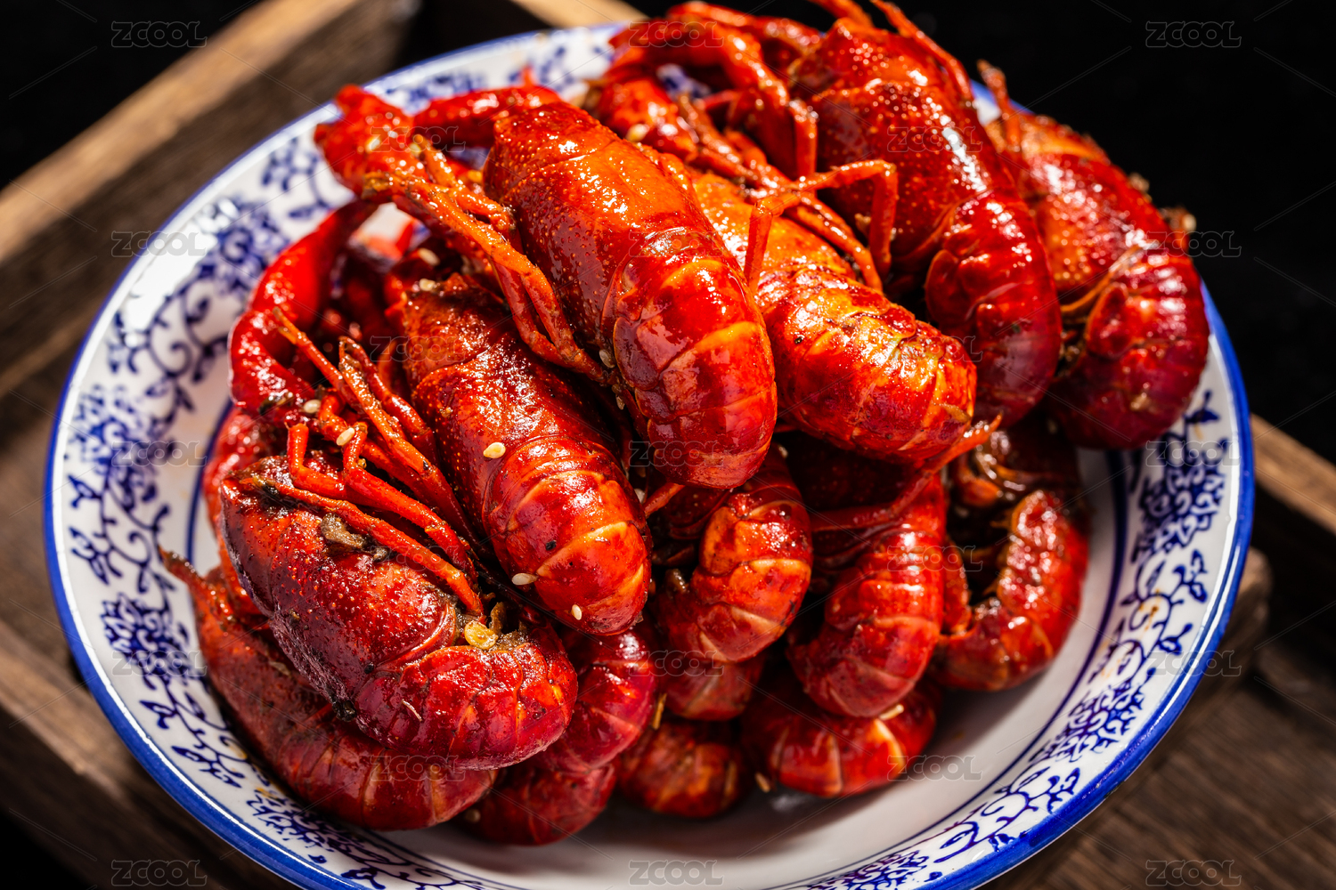 木板背景上满满一盘麻辣小龙虾