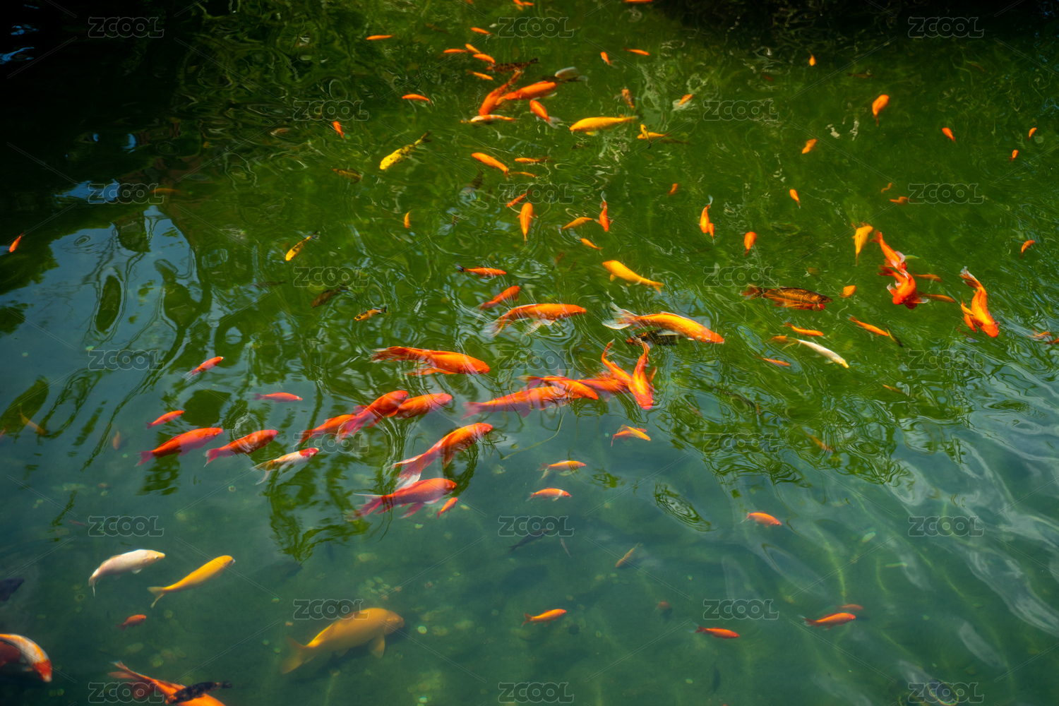池塘中颜色艳丽追逐嬉戏的锦鲤
