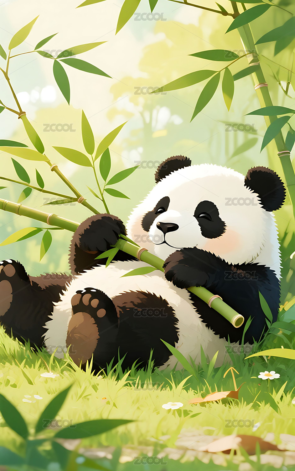 可爱大熊猫在竹篮里玩耍竹子治愈国风插画