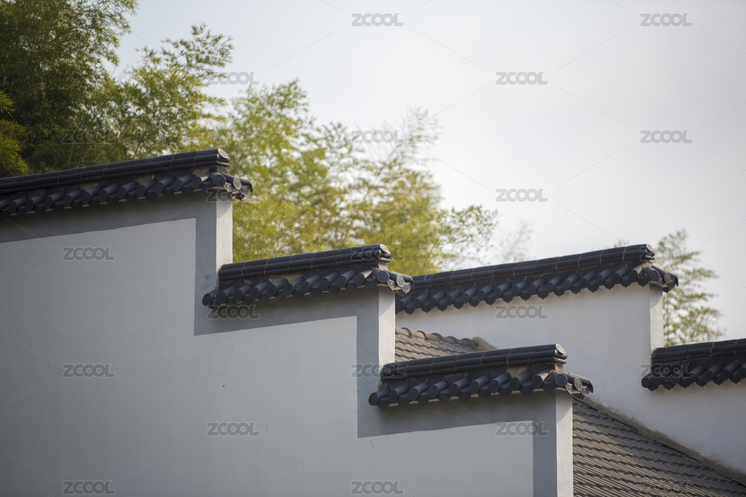 具有徽派建筑风格灰瓦白墙的公园围墙
