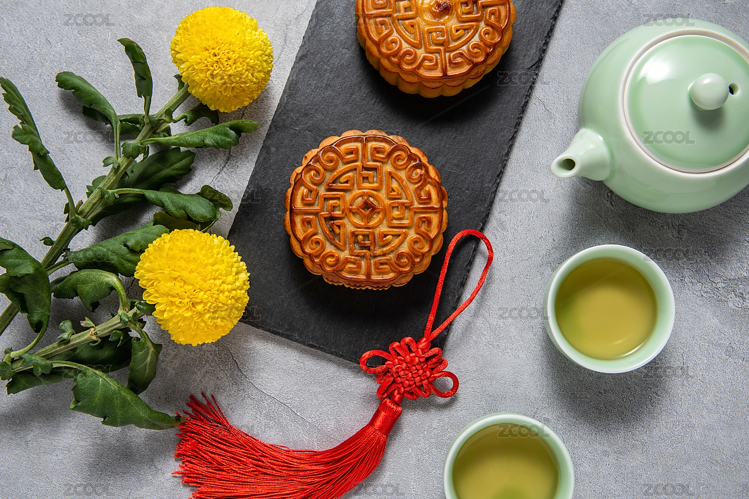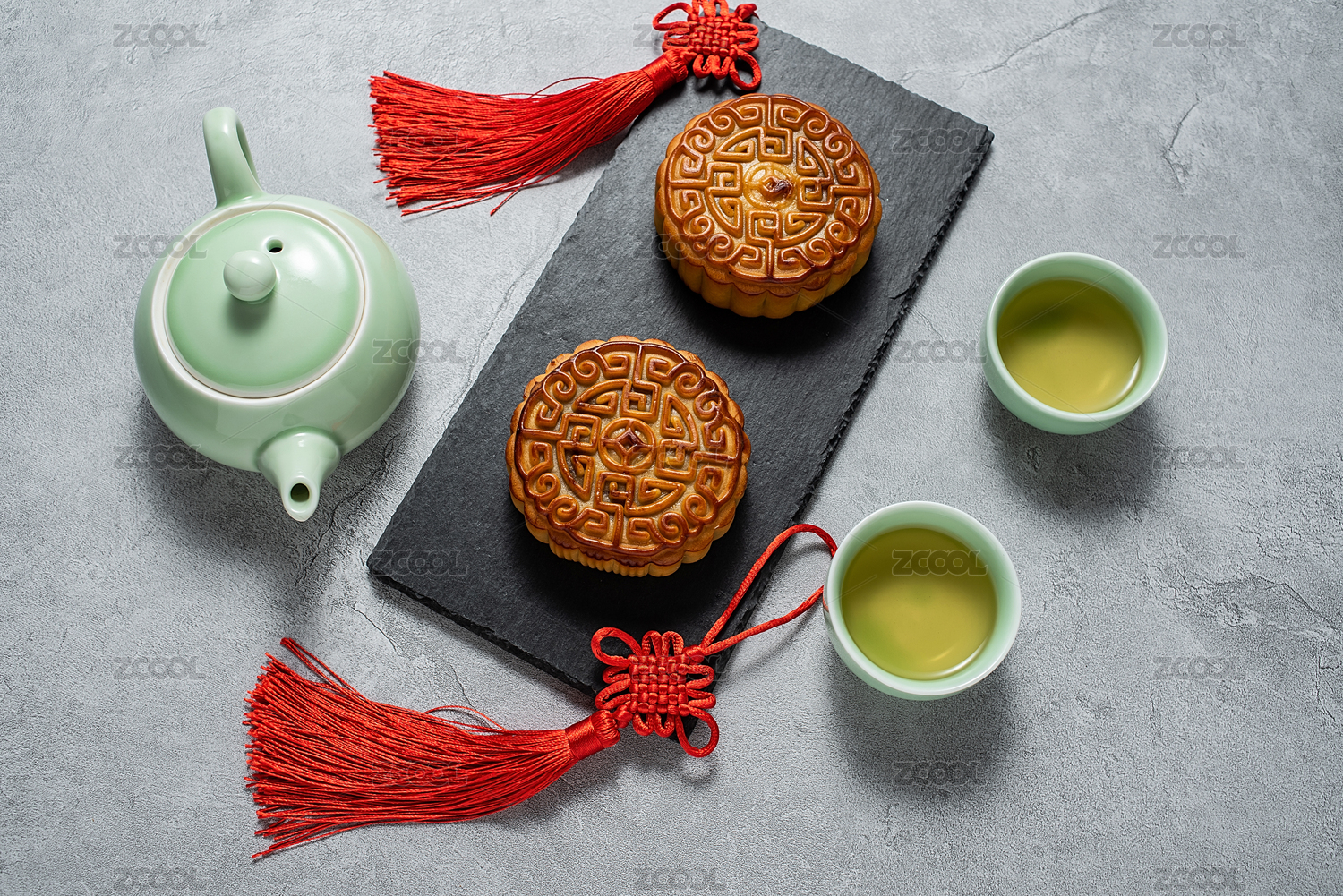 中国中秋节美食,水泥质感背景的月饼和茶水