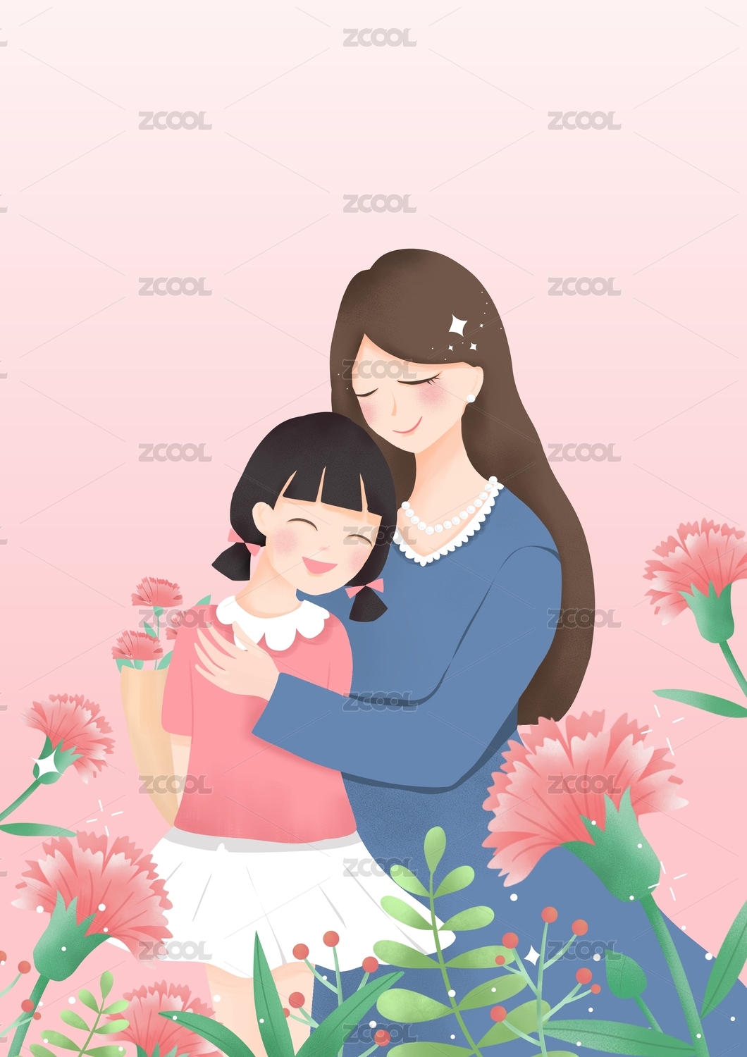 母亲节母女拥抱插画感恩节家人庆祝活动海报