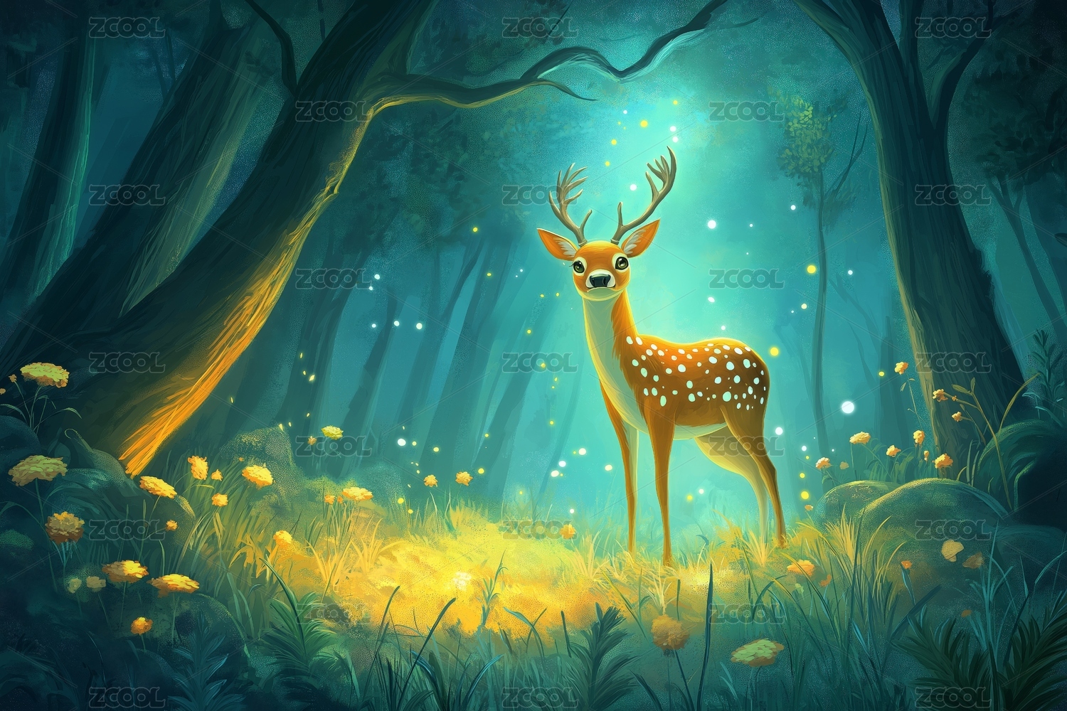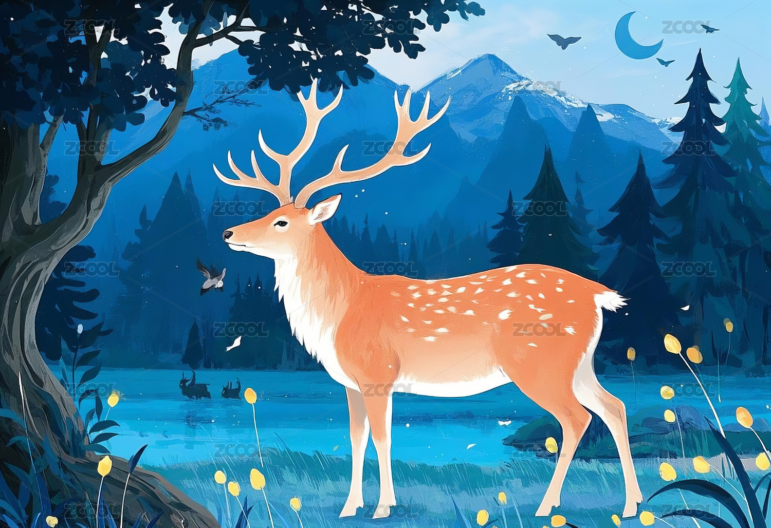 梦幻,唯美,插画,夜晚,月,神秘,森林,月亮,鹿,动物