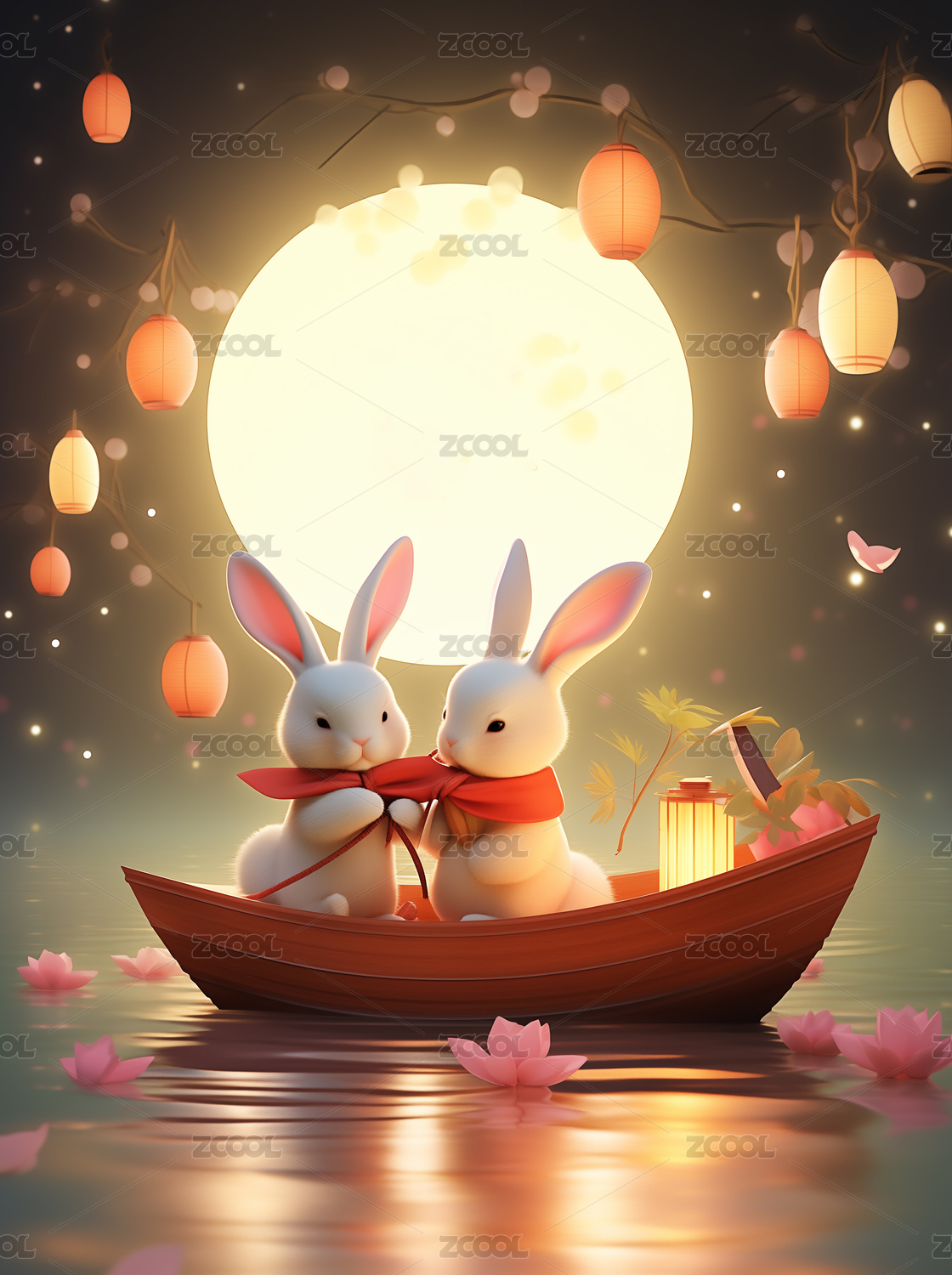 兔子蹲在月亮两旁在飘着水灯的河上赏月