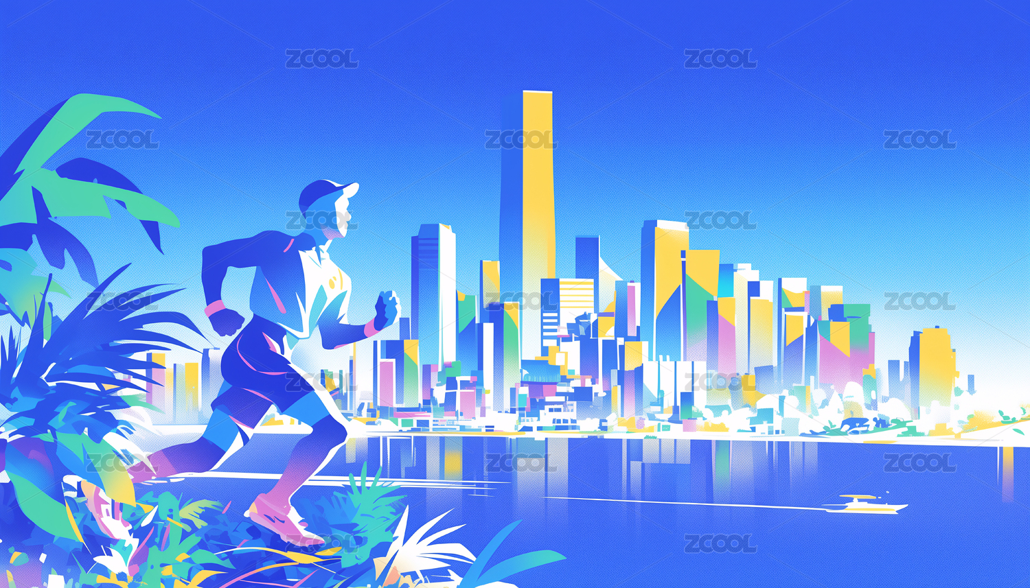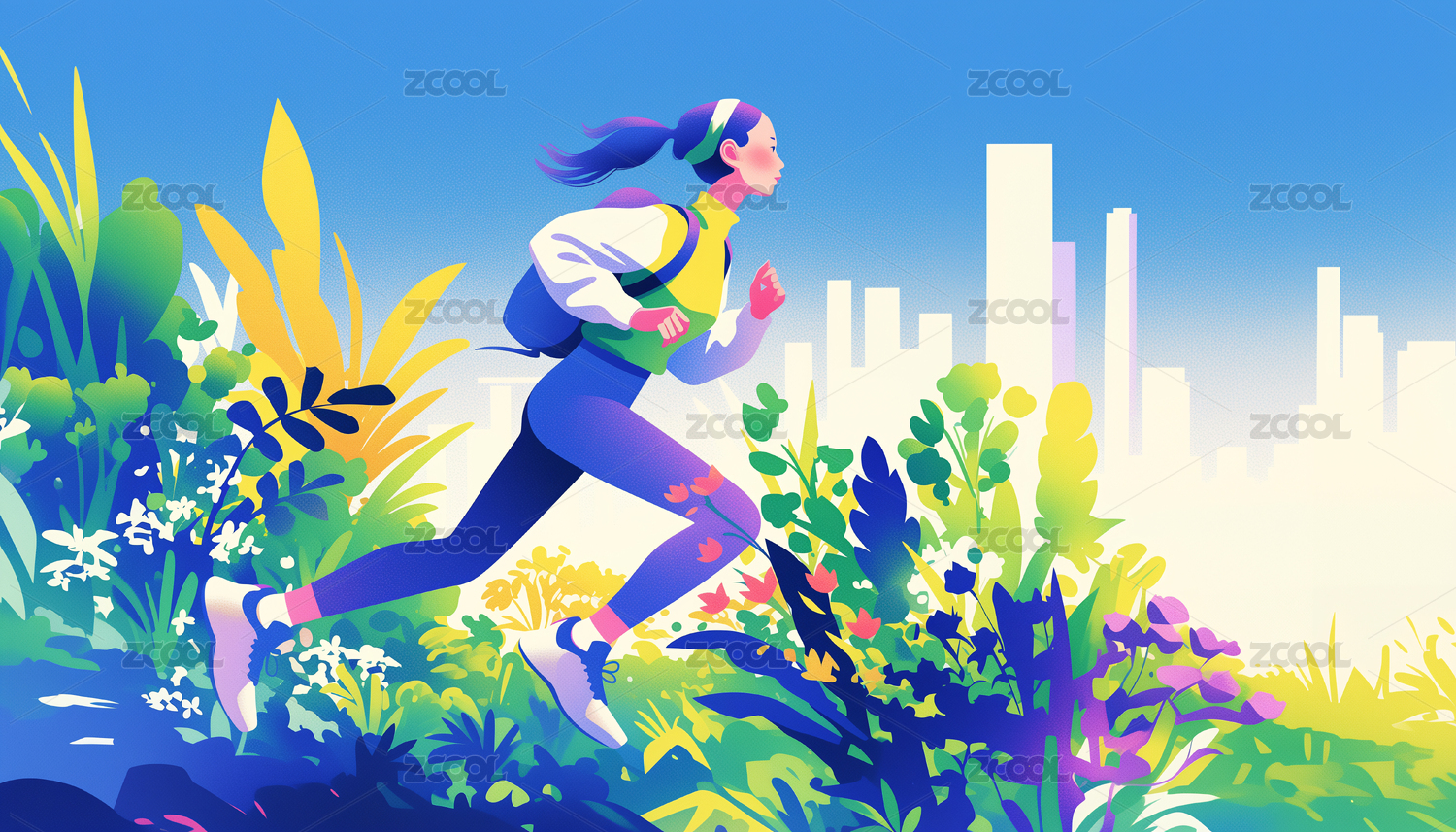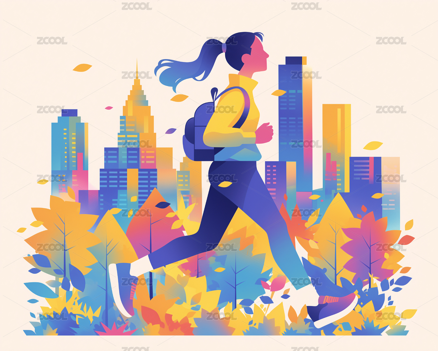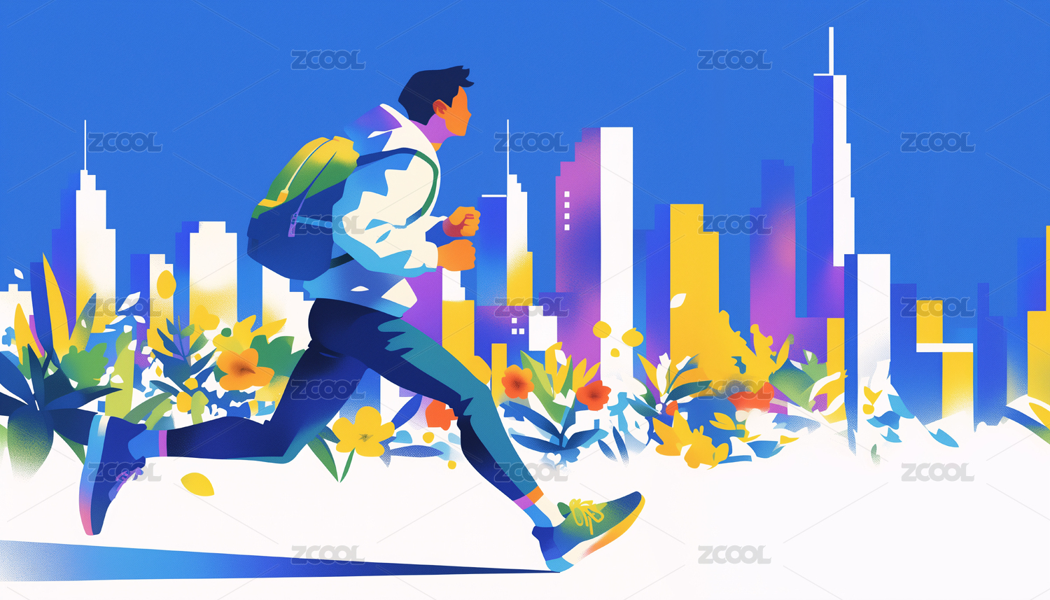 插画,潮流,渐变,男性,奔跑,商务,花草,帽子,背包,跑步
