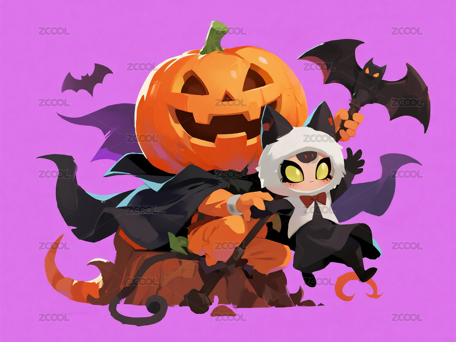 橘色扁平南瓜蝙蝠猫万圣节元素