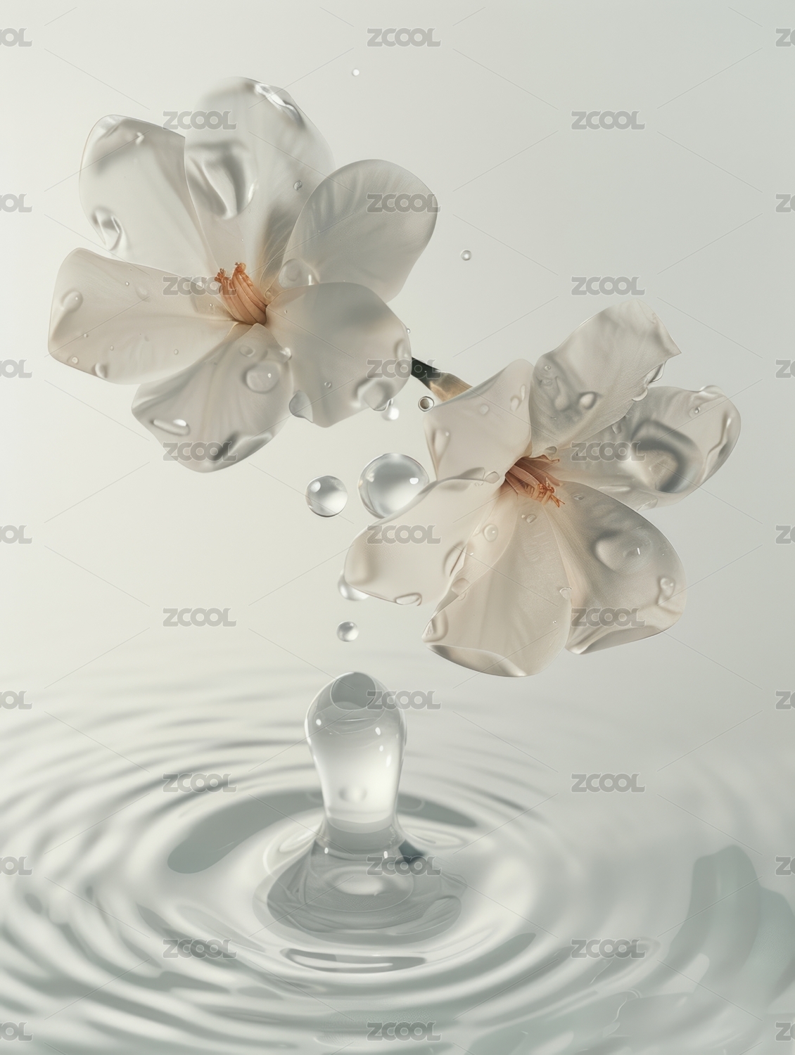 玻璃状的花朵上覆盖着水滴,纯色背景,水