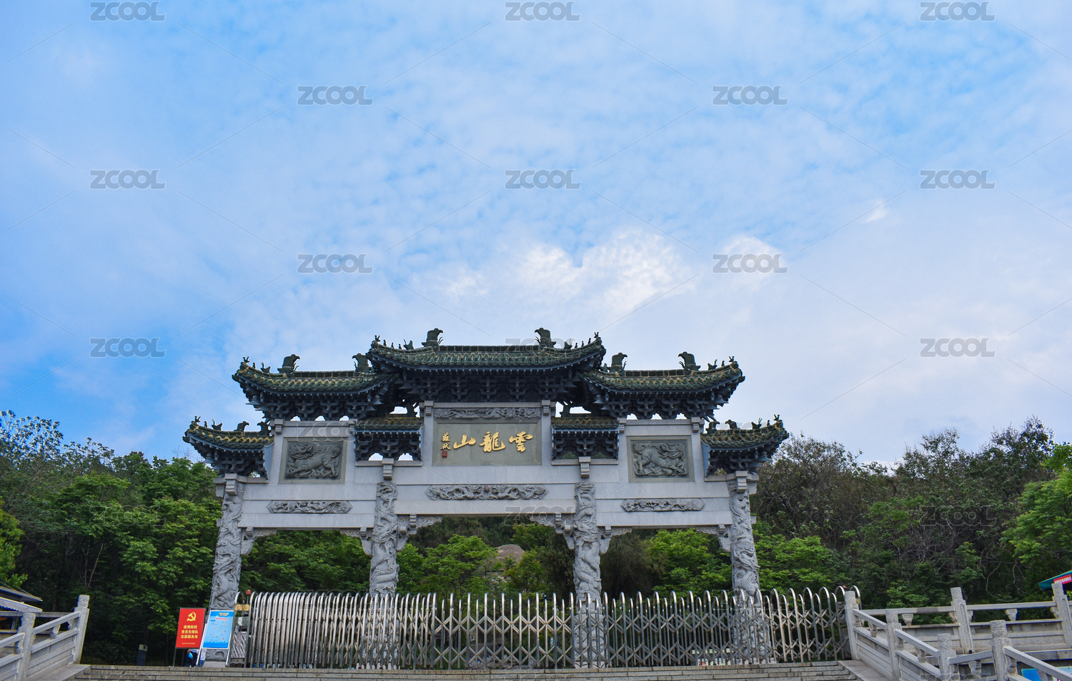 蓝天白云下重庆江北鸿恩寺森林公园的牌坊