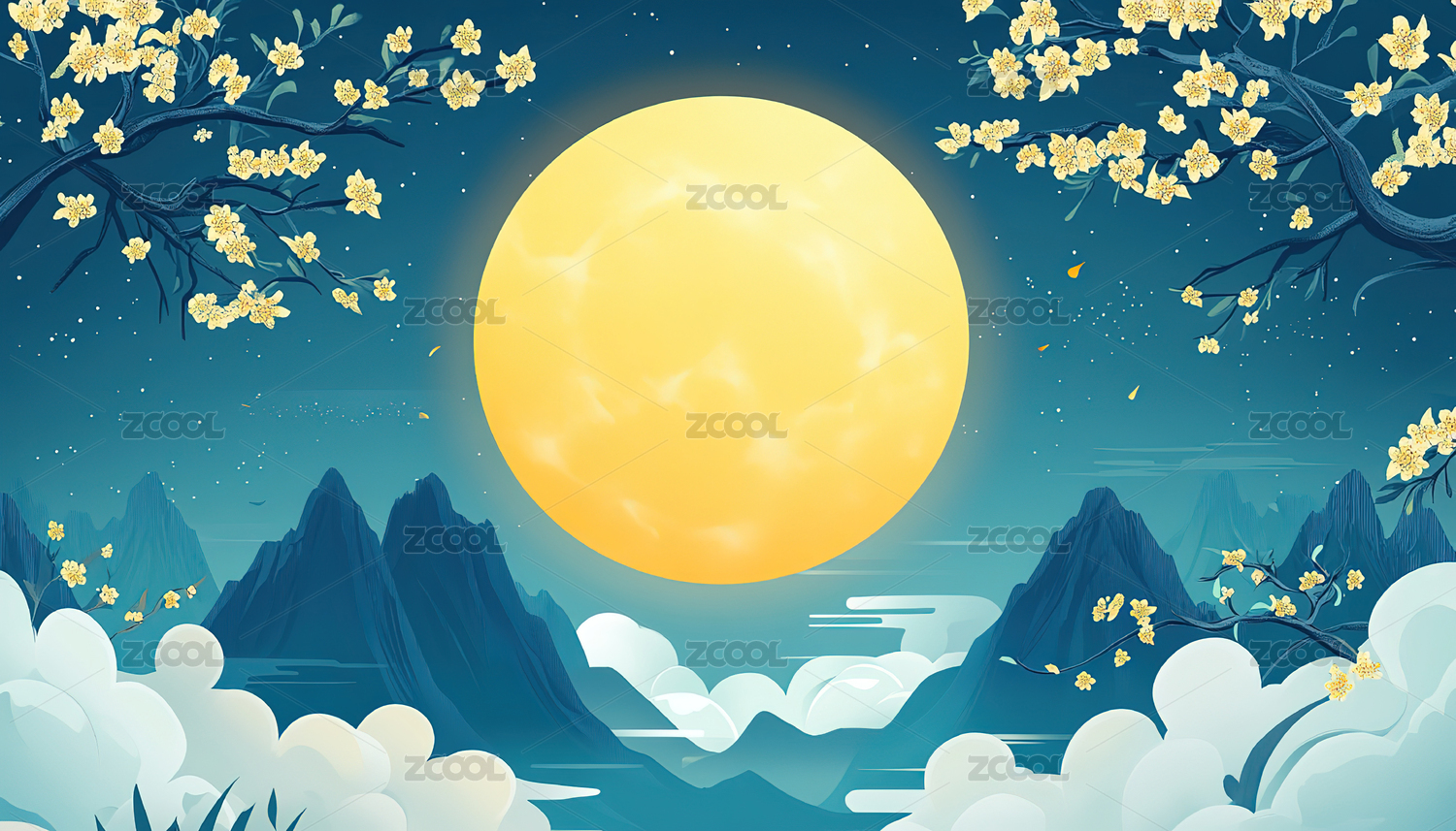 中秋节,月亮,圆月,桂花,花朵,植物,窗户,中式,国风,国潮风