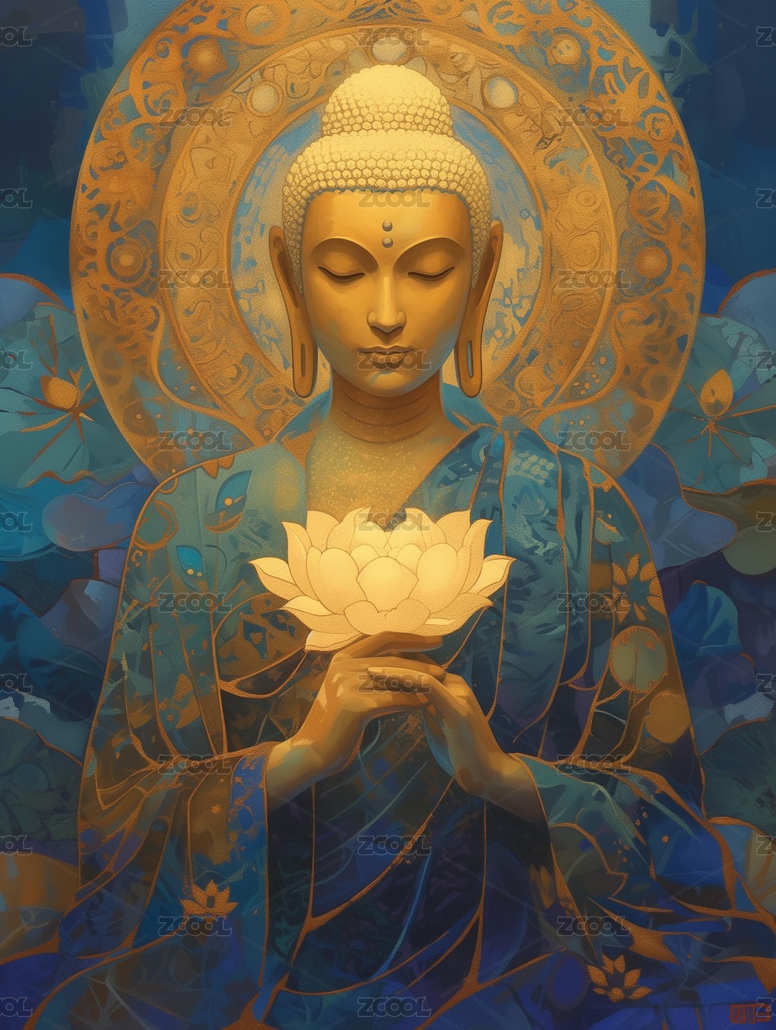 AIGC202407,佛陀,莲花,水面,光环,花朵,叶子,星星,星云,光束