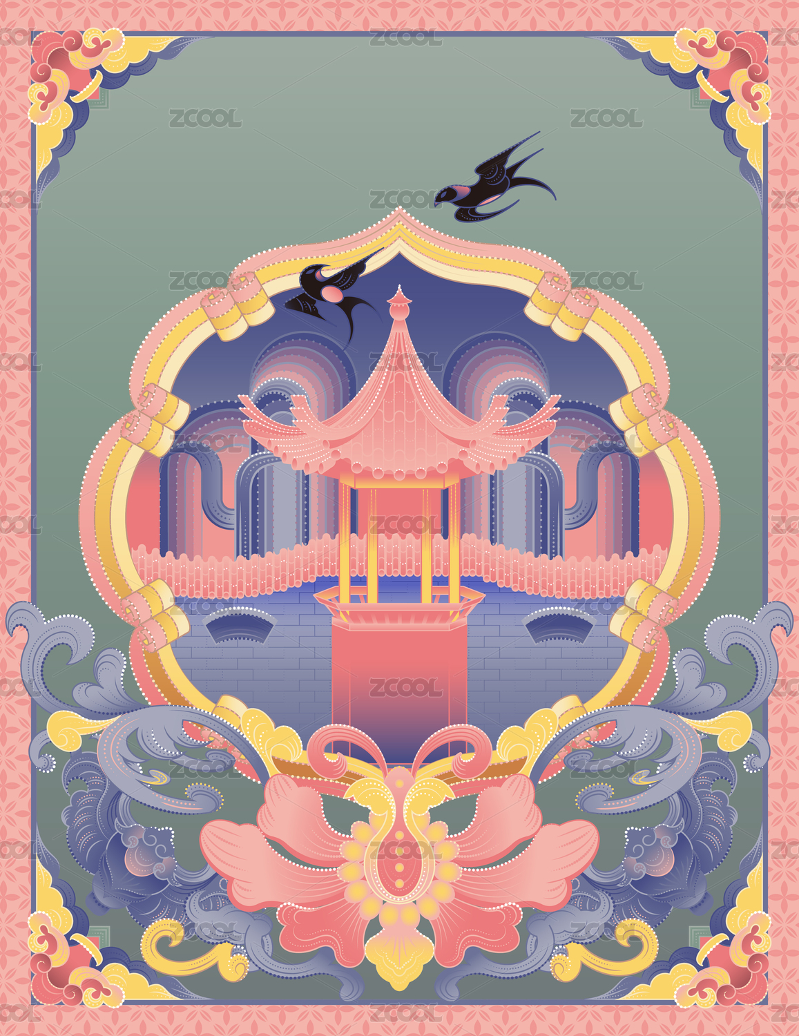 包装插画,丝巾图案,花窗丝巾图案,丝巾插画,园林花窗插画