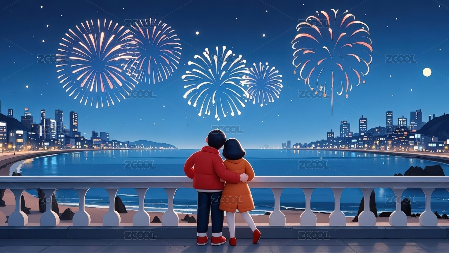 情侣在城市天台看夜晚烟花浪漫唯美治愈插画
